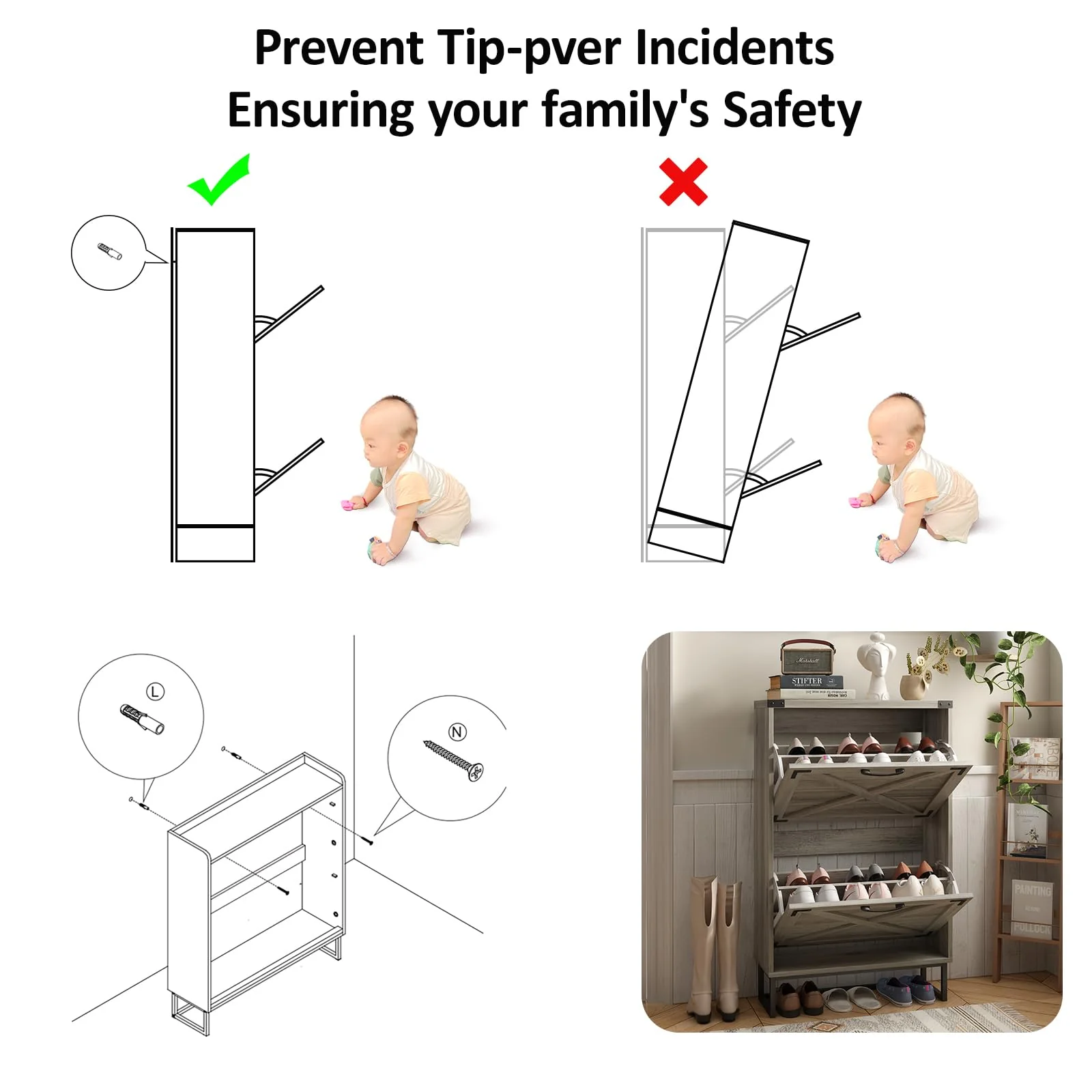 - ��Safe and Reliable Quality��: This slim shoe cabinet contains an anti-tipping device. which can be fixed on the wall to prevent tipping and protect children's safety. Made of high-quality MDF wood and metal legs. the stable structure ensures super load-bearing capacity. The black metal handle is simple and elegant. feels comfortable. and prevents scratches and injuries during use. Metal legs have rubber pads on the bottom to provide stable support while preventing the floor from being scratched.