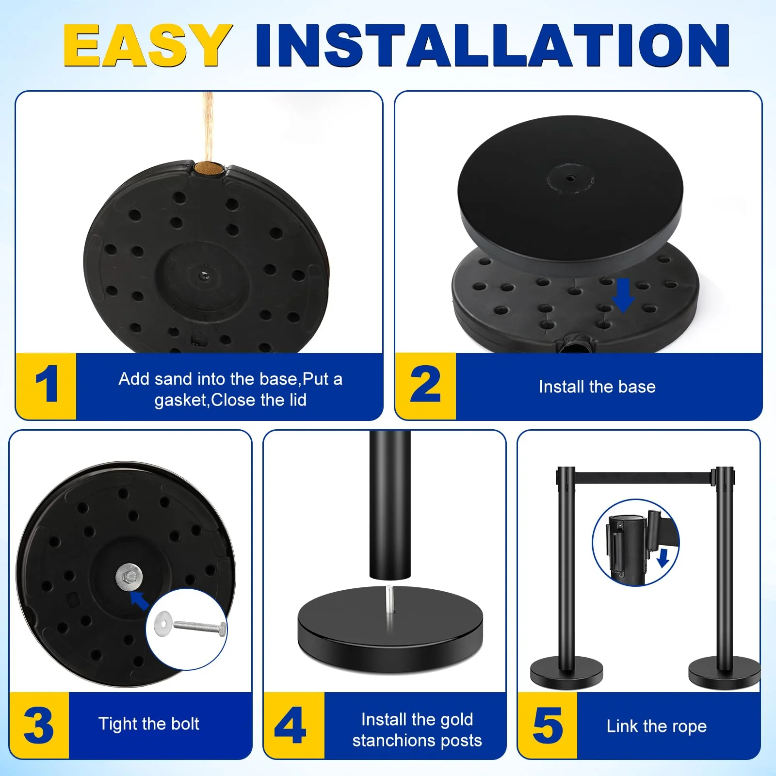 - Stable Base: Our stanchions base are strong enough to withstand wind and crowds. stable and reliable. ensuring that the posts are not easy to move and topple over. No skid rubber base ensures your Stanchion stays where you put it without sliding or falling over.