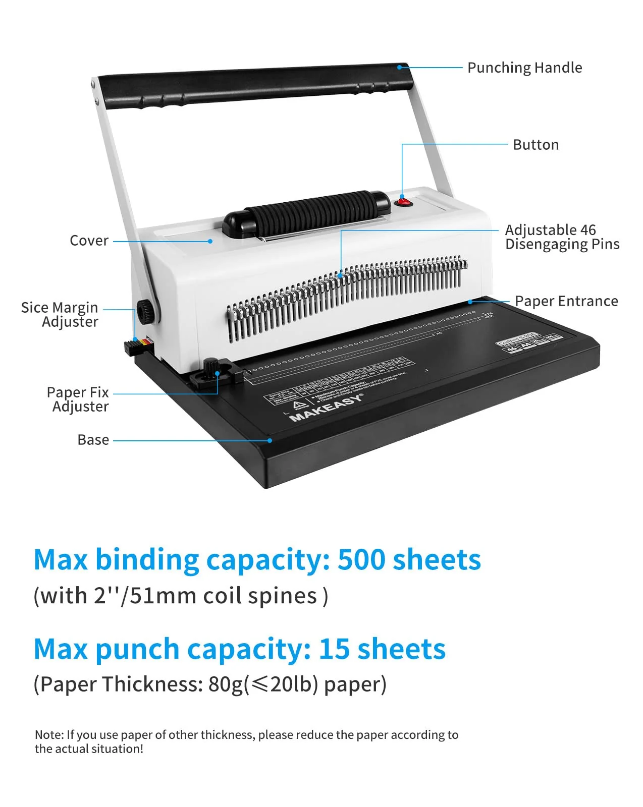 - ��SUITABLE FOR MULTIPLE PAPER SIZES��46 Disengaging Pins Die design. fully adjustable disengageable pins let you control where the binding machine punches holes. Open-throat design allows you to insert large and non-standard page sizes. This UPGRADED coil binding machine is suitable for Letter Size (42 holes). A4 Size (46 holes). A5 Size (33 holes).... Simply apply steady pressure to punch holes in up to 20 sheets of 80g(paper thickness��20lb) paper at a time.