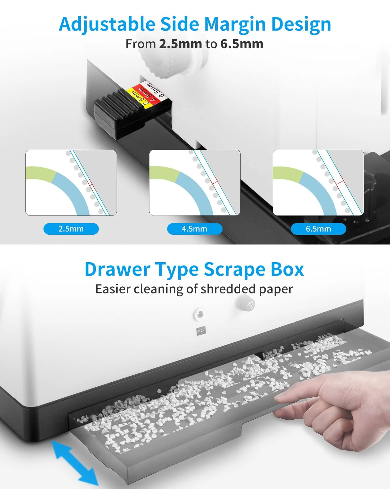 - ��ADJUSTABLE MARGIN��With adjustable side and edge guide. this machine also ensures a precise alignment with each document your bind. and you can easily customize the paper margin: 2.5mm. 4.5mm. 6.5mm to create professional-looking works.