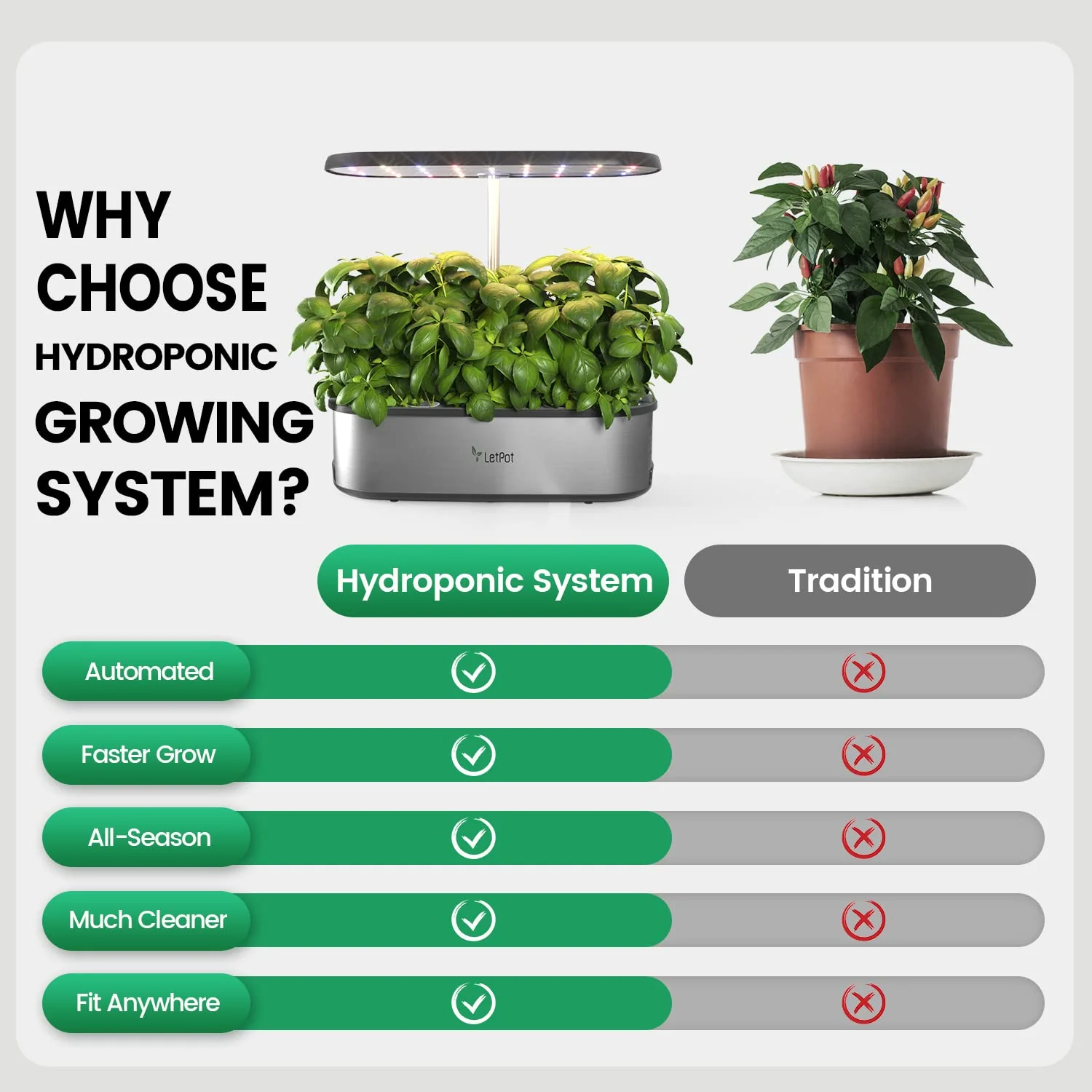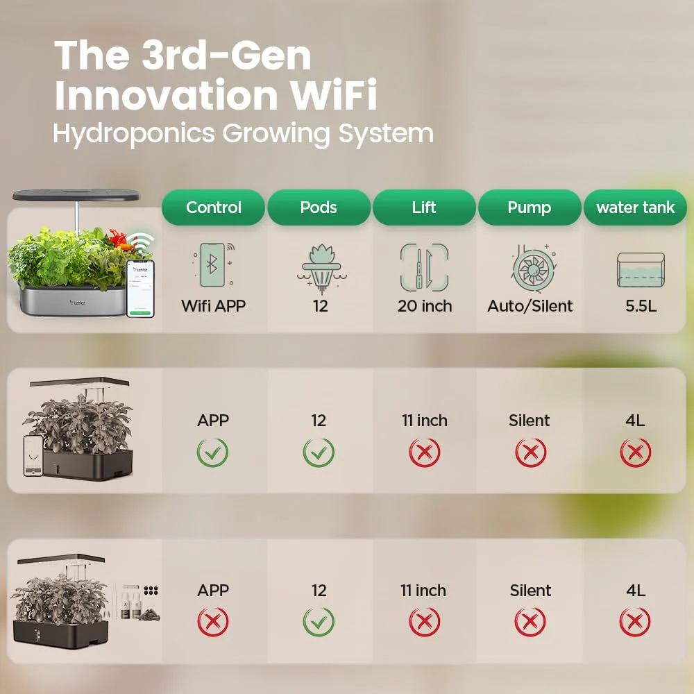 - PATENTED SMART HYDROPONIC SYSTEM: Take your indoor gardening to the next level with our patented smart hydroponic system. featuring the exclusive LetPot app. With just a few taps on your phone. you can effortlessly adjust the LED lighting schedule to provide your plants with the perfect amount of light. Our innovative reminder system also ensures you never forget to water your plants again. making growing healthy and vibrant plants easier than ever before.