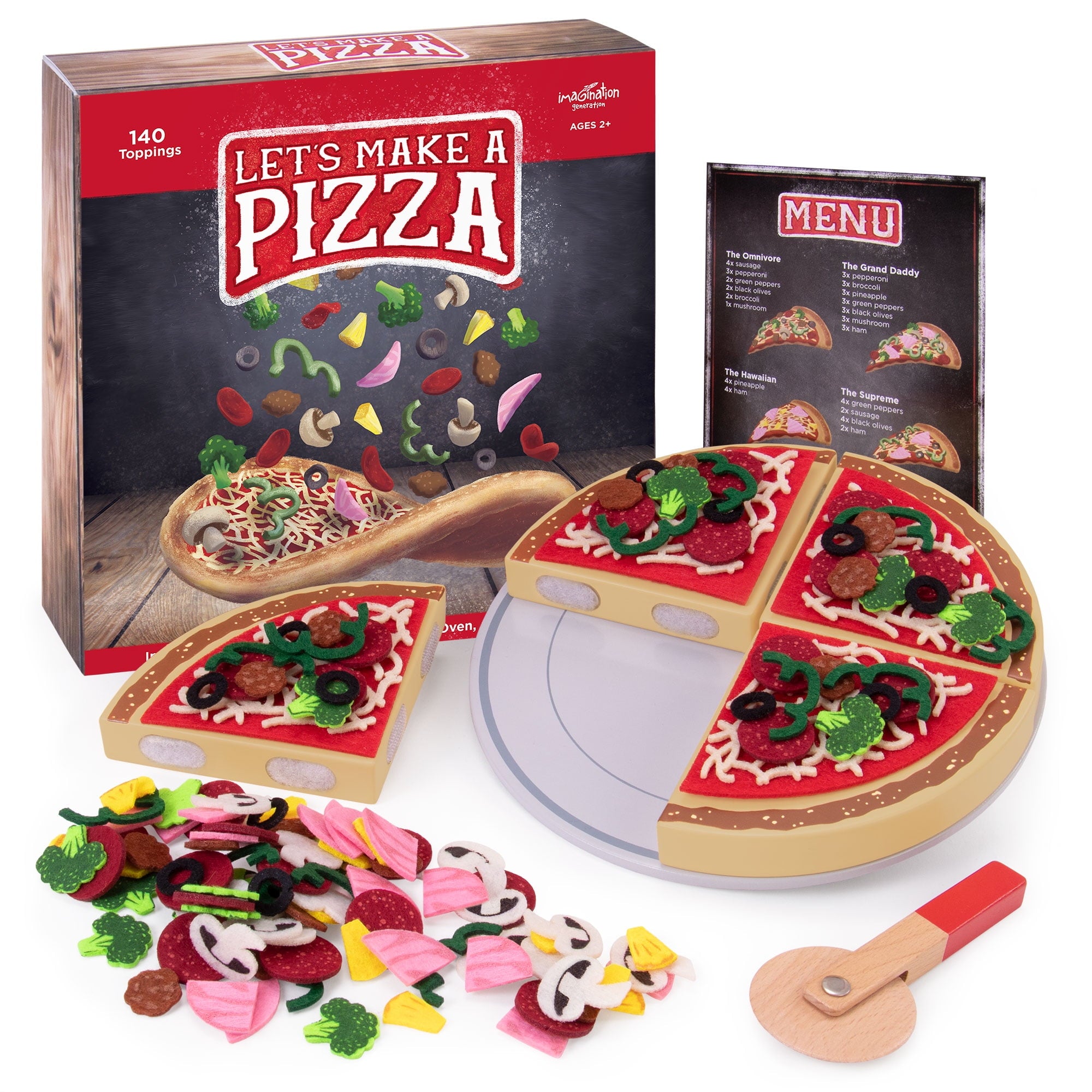 - WHAT'S ON THE MENU: Fully stocked with 4 wooden slices of pizza crust and 140 ingedrient toppings made of felt. Includes cheese sauce pepperoni mushrooms pineapples green peppers sausage ham broccoli and black olives