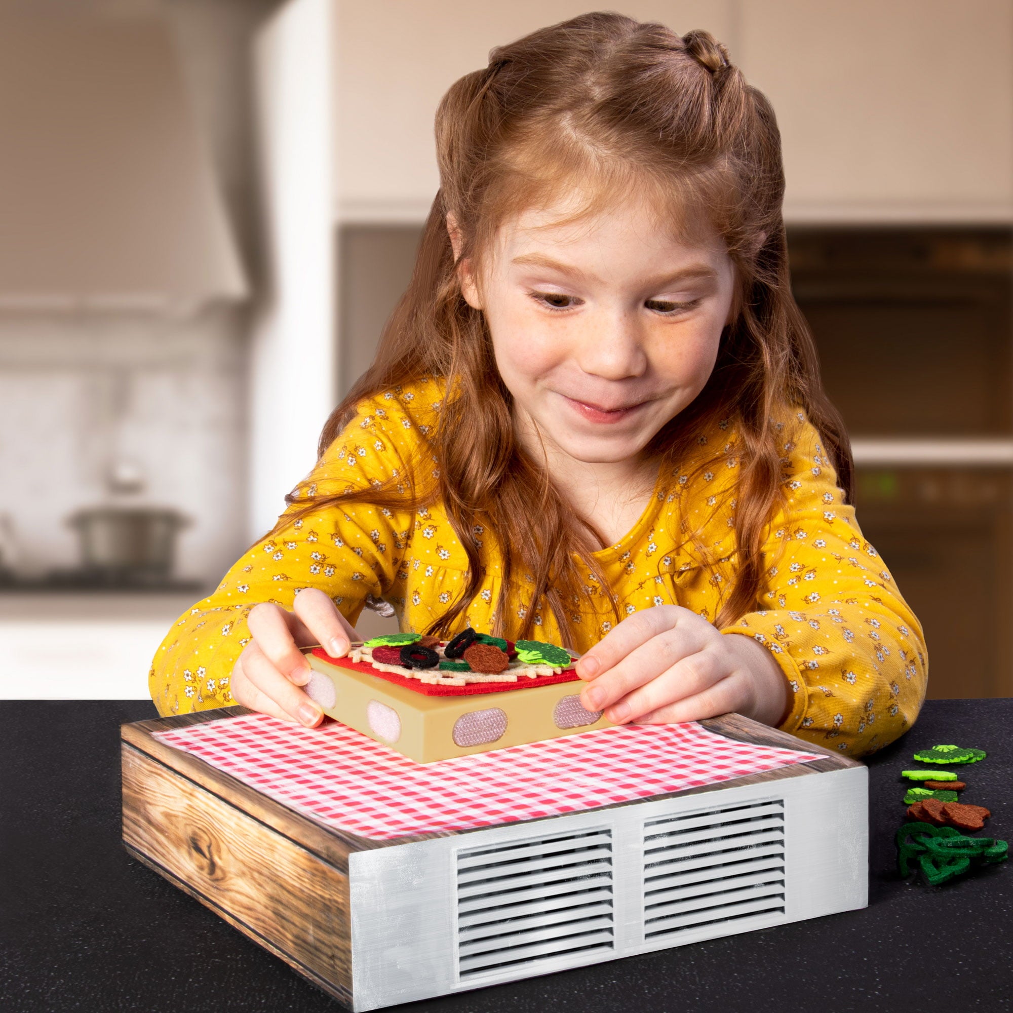 - NO PLAY KITCHEN REQUIRED: Smart box art design with prepping board on one side and opens up like an oven. When the pizza is ready take it out of the oven flip the box over and place your hot-n-ready pizza on the serving table with a checkerboard picnic blanket