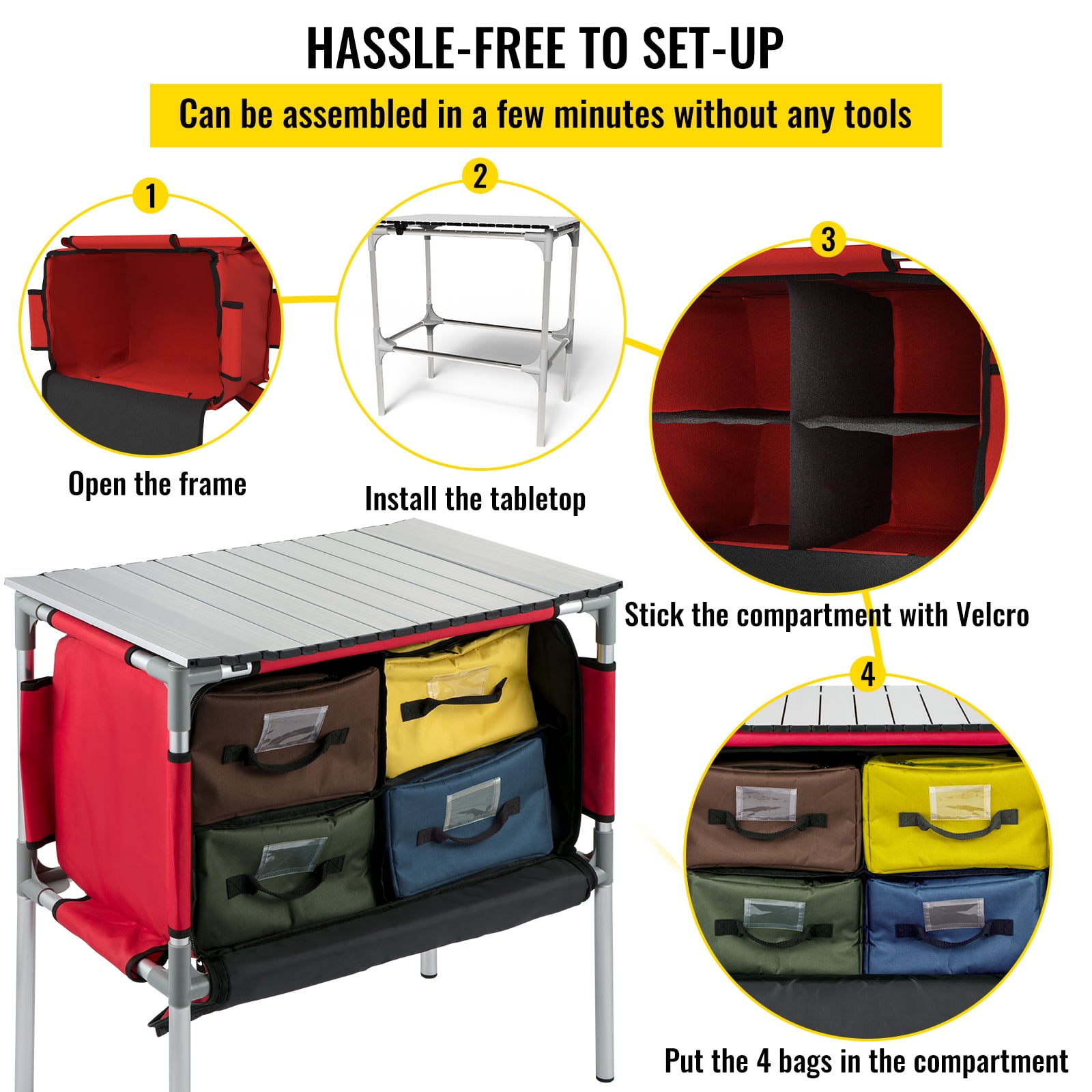 - Convenient Installation in Minutes: The camp kitchen is easy for you to unfold set up and fold in minutes. Take out the camping table install the tabletop and legs stick the compartment with Velcro and put the 4 bags in the compartment. Then a firm foldable camping kitchen is ready for you.