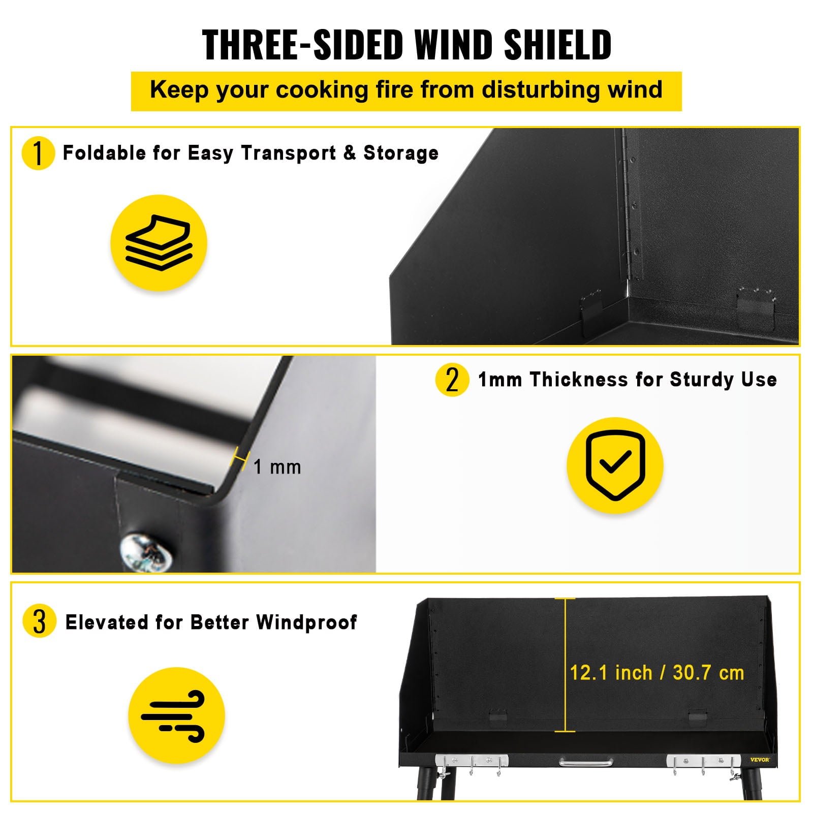 - Considerate Details: Our camp table is equipped with a 12.1-inch height three-sided windshield ensuring the stability of your cooking fire. It also adopts a foldable and detachable design allowing you to transport and storage it separately and effortlessly. In addition the hooks are well-designed for hanging spoons brushes and other cooking utensils; the handle brings you an easy operation; the 0.8-inch height adjustable and 30-150 degrees angle adjustable feet can adapt to uneven grounds.