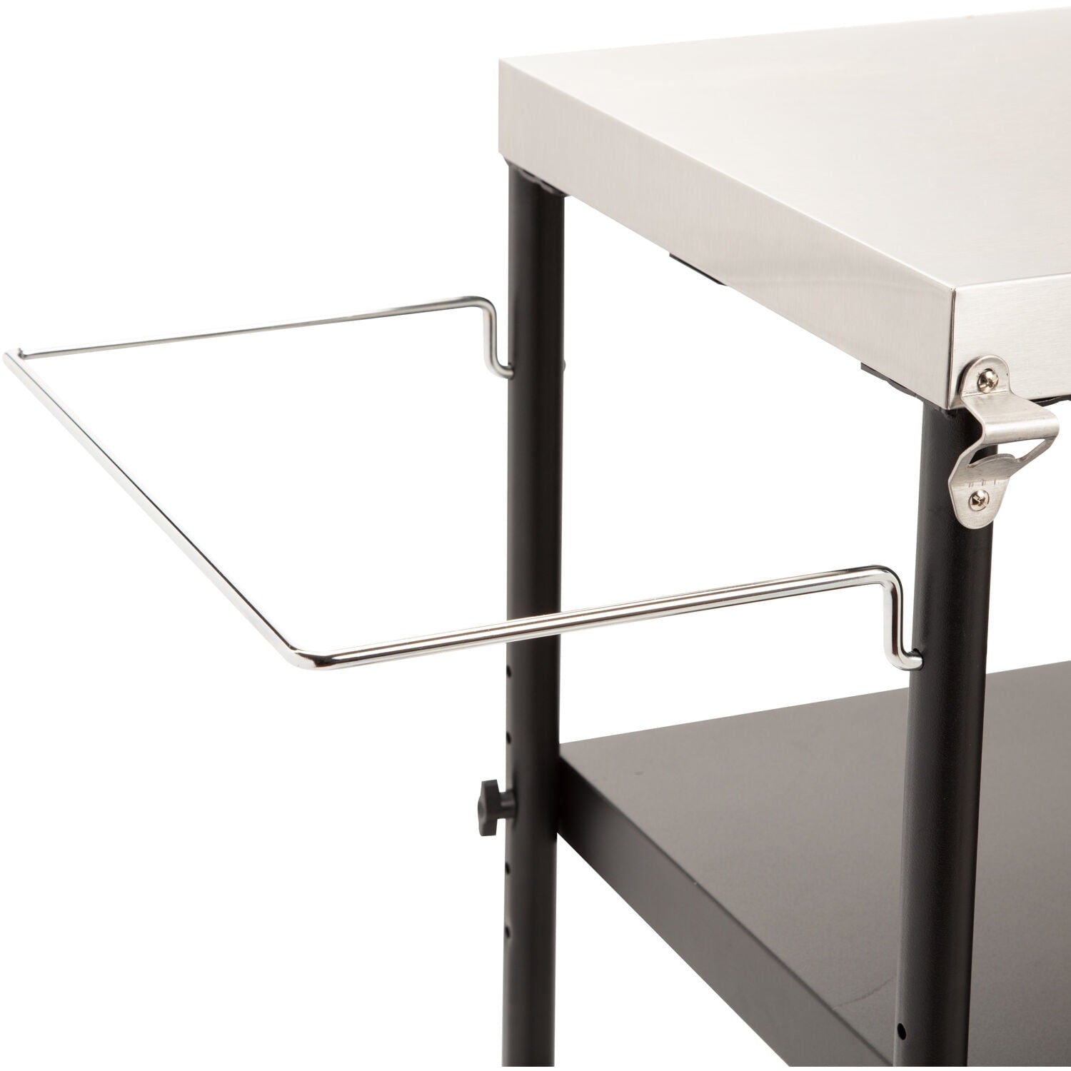- Paper towel holder can accommodate a jumbo roll of paper towels and is conveniently located to the right of the work surface
