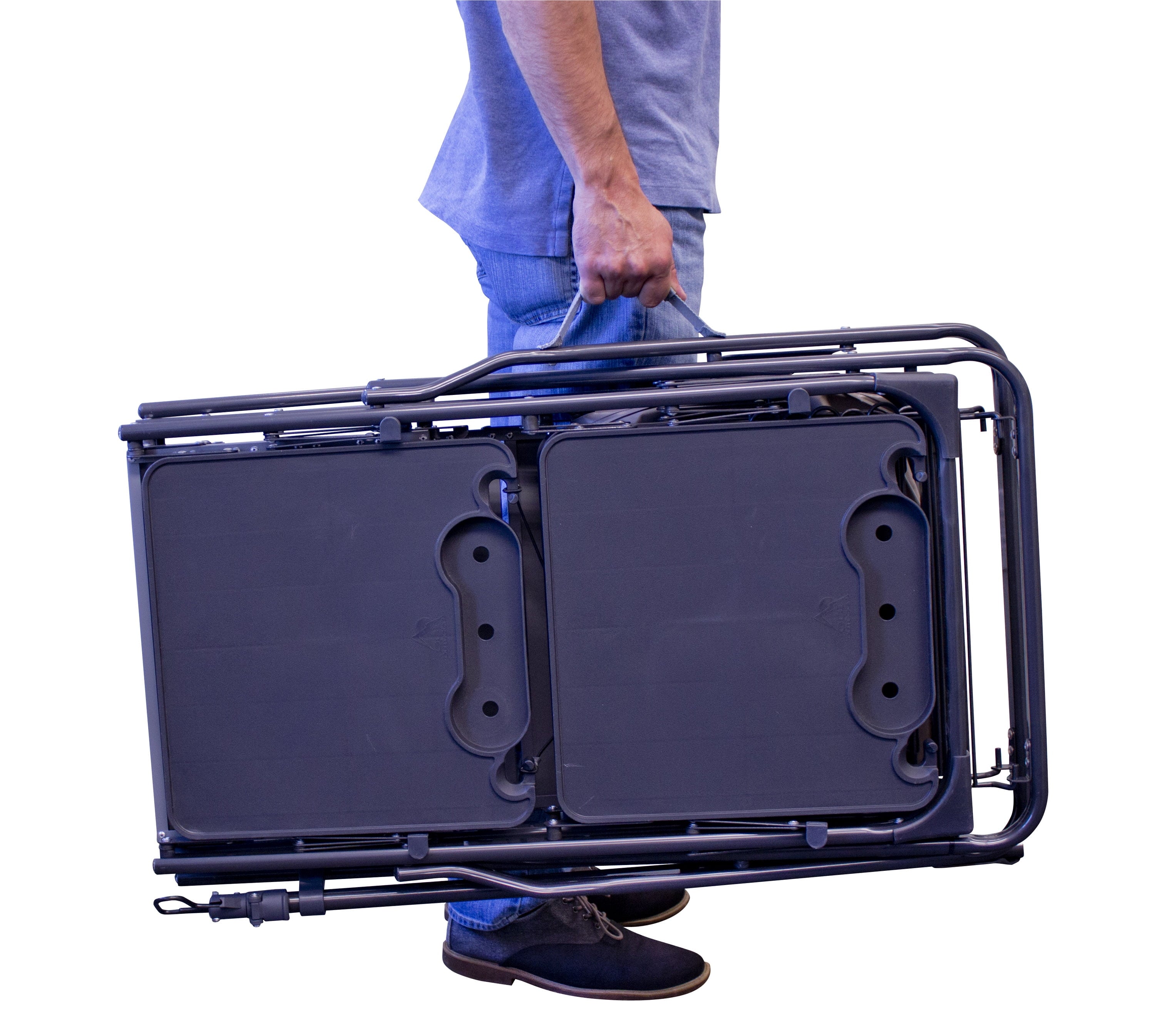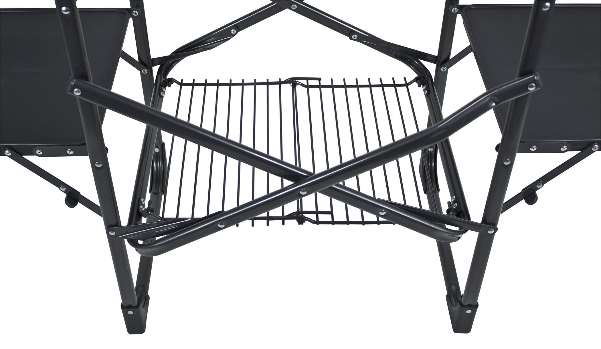 - Folds flat for storage One piece no hassle design Powder-coated steel frame Heat-resistant aluminum counter tops (weight limit: 48 lb/21.7 kg) Storage rack (weight limit: 35 lb/15.9 kg) 3 multi-use fold-out side tables ? beverage wine glass garbage bag paper towel and utensil holder (weight limit per table: 30 lb/13.6 kg).