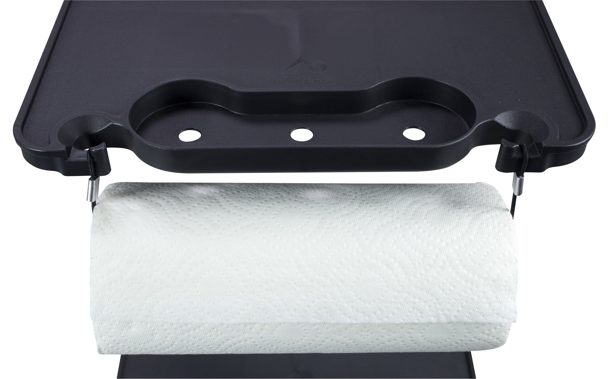 - Three fold-out side tables hold food/beverages and paper towels and have hooks for grilling utensils and garbage bags as well as stem glass holders.