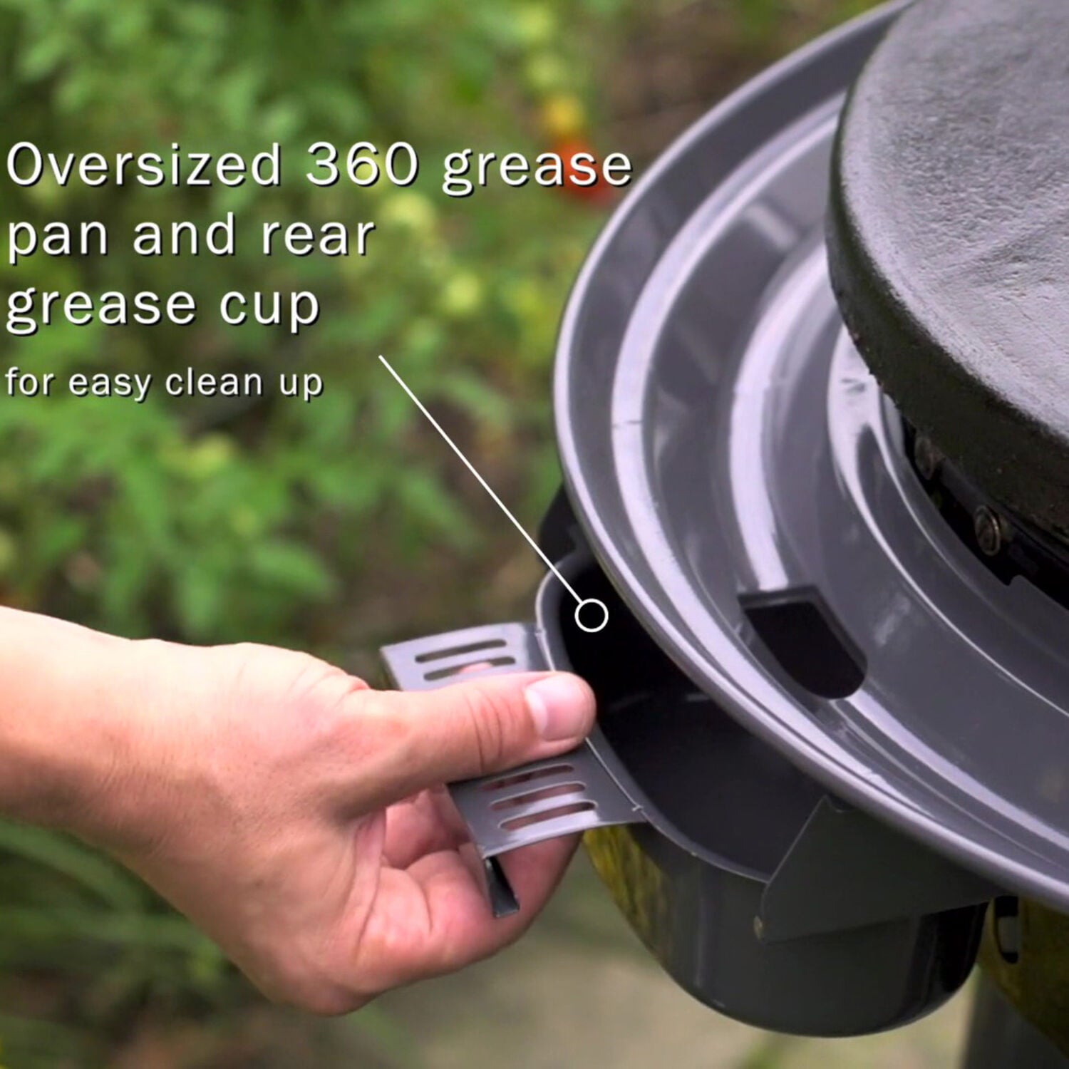 - Oversized 360-degree grease pan naturally funnels grease to the grease cup for easy clean up