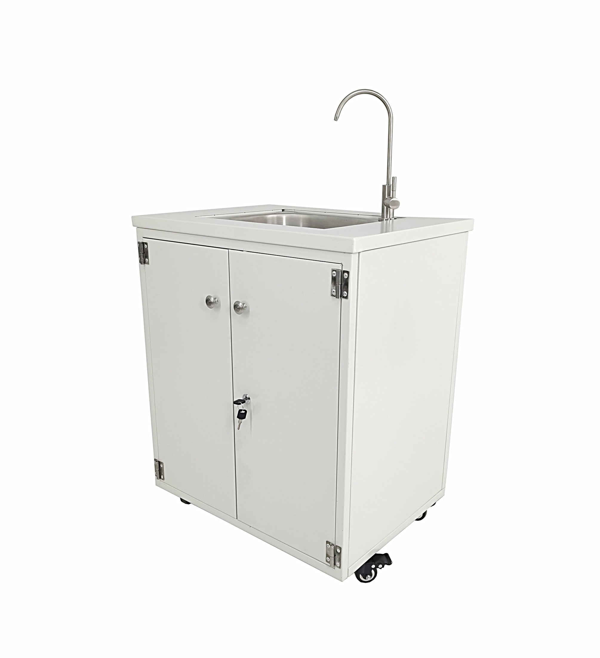 - This Portable Metal Sink Self Contained Hand Wash Station Mobile Sink Water Fountain w/Pump is great for pre-schools day cares laboratories clinics hospitals food truck services festivals county fairs shopping malls supermarkets factories and other public places to have water available for quickly washing hands or dispense drinking water or for lab work. Cabinet size is 24 Width X 29 Heigth X 18.3 Deep. Faucet is 10.5 tall. Waterline is 1/4. Single line.