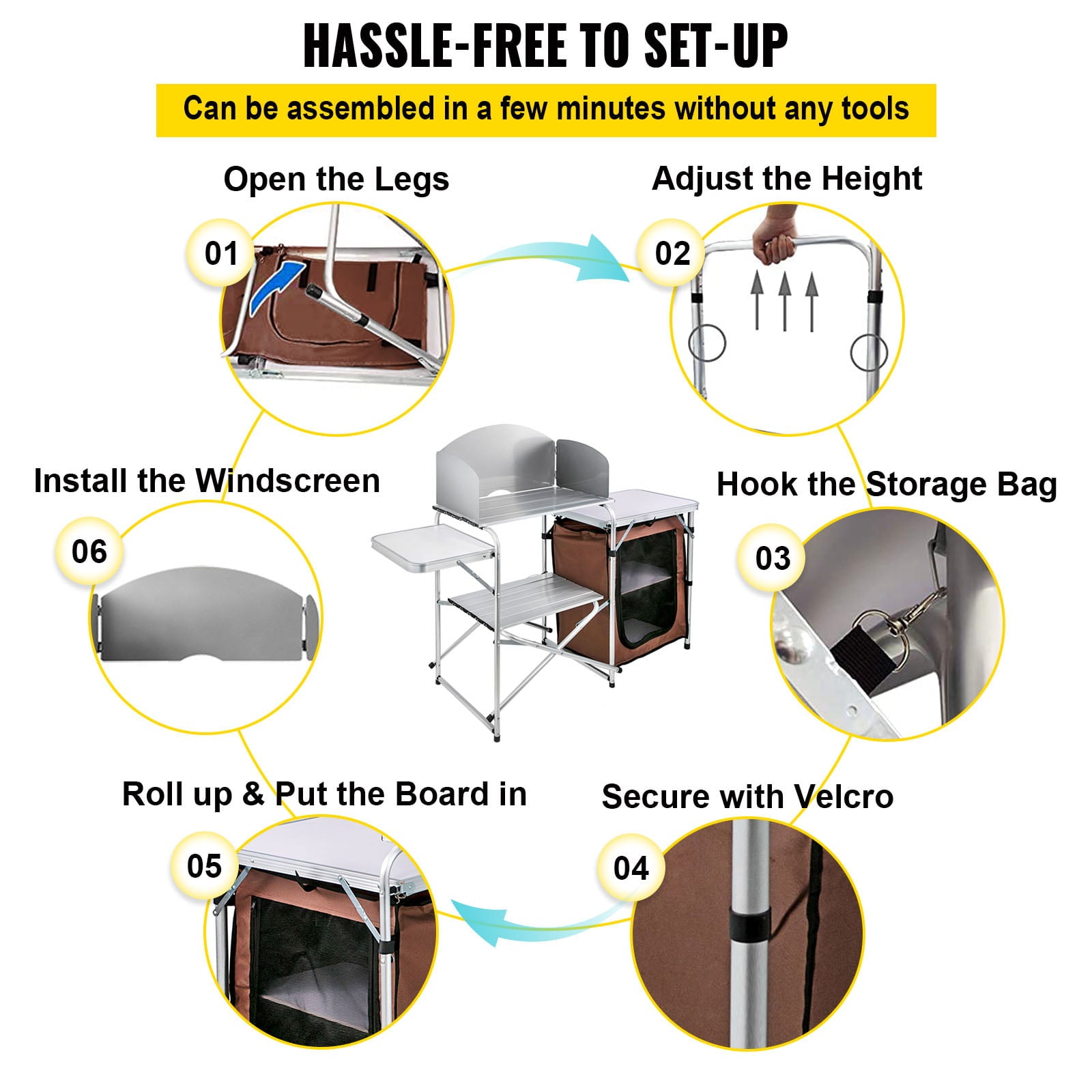 - Convenient Installation in Minutes: The camp kitchen is easy for you to unfold set up and fold in minutes. Take out the camping table from the carrying bag adjust the leg height press the hasp and button to lock it tie the hook and Velcro and put the top board and shelf in the correct position. Then a firm foldable camping kitchen is ready for you.