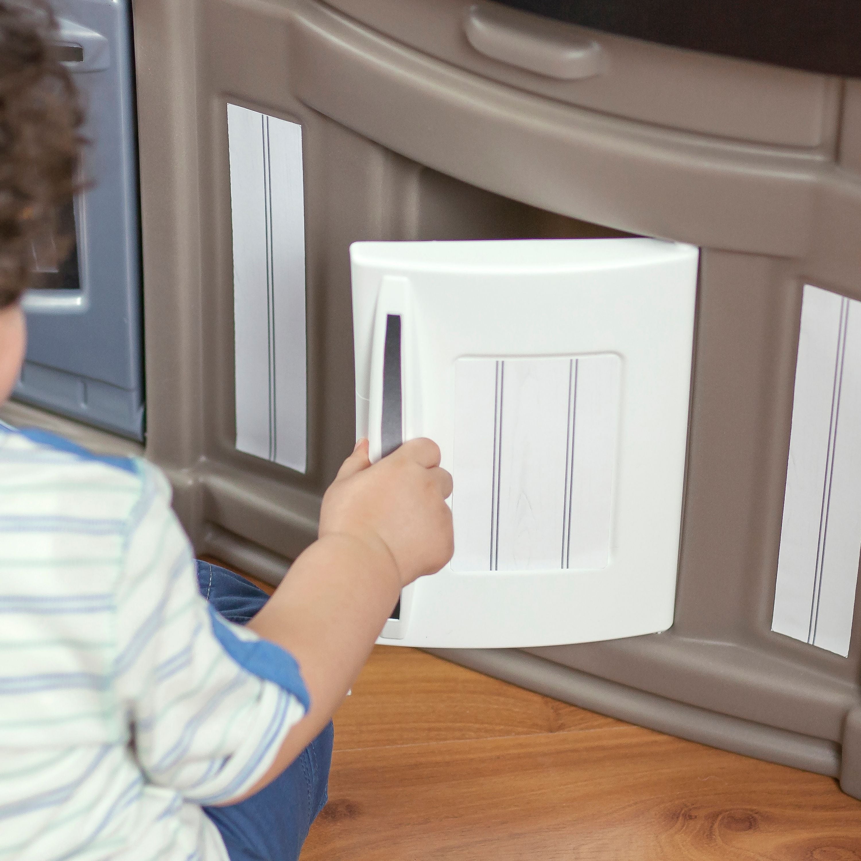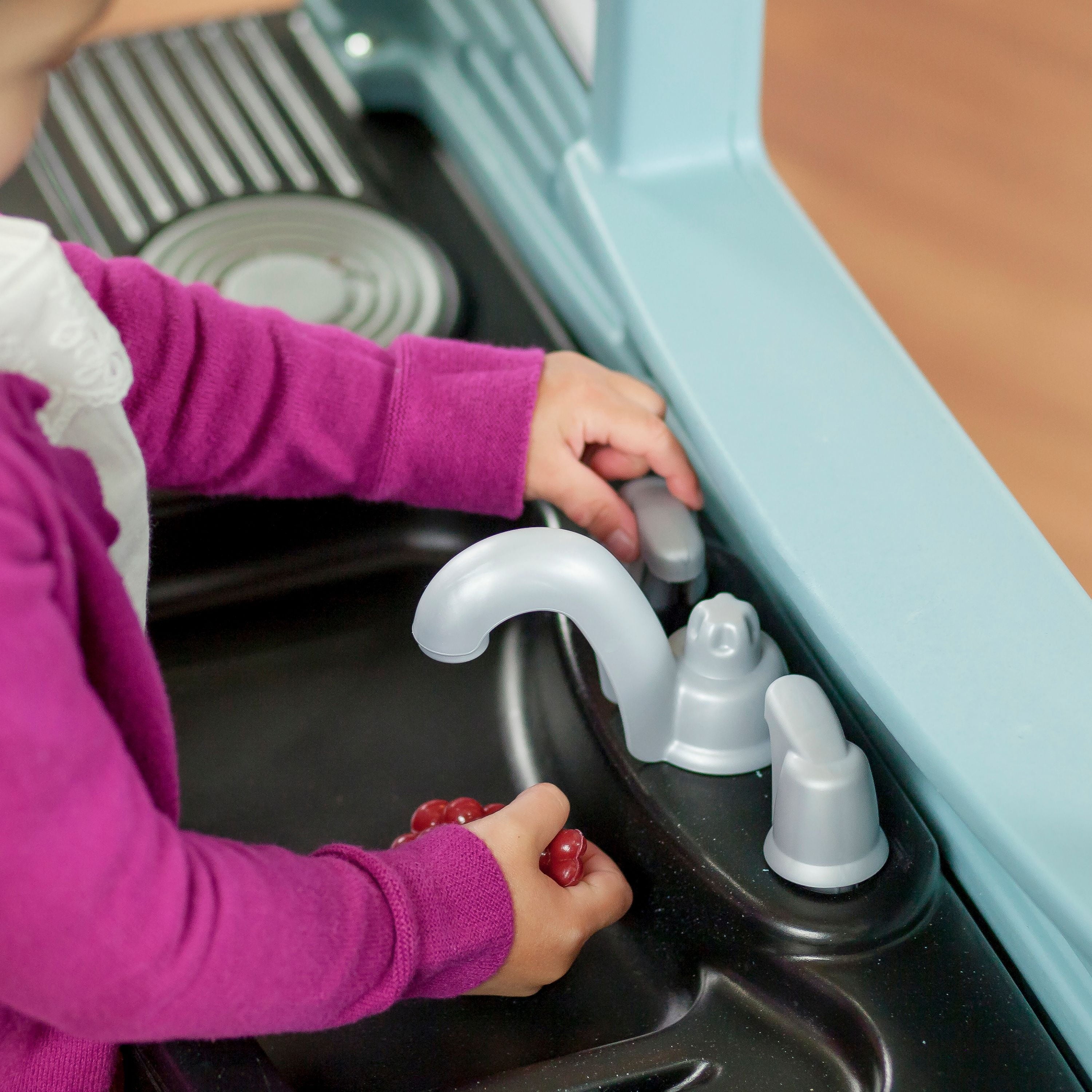 Features:Working oven refrigerator door ample counter space and pass-through window Stove burner features fun lights and sounds Clicking knobs on stove top and oven for more realistic play Plenty of storage space including the recycle bin hooks for hanging utensils and tea/coffee cups Includes 25-piece accessory set