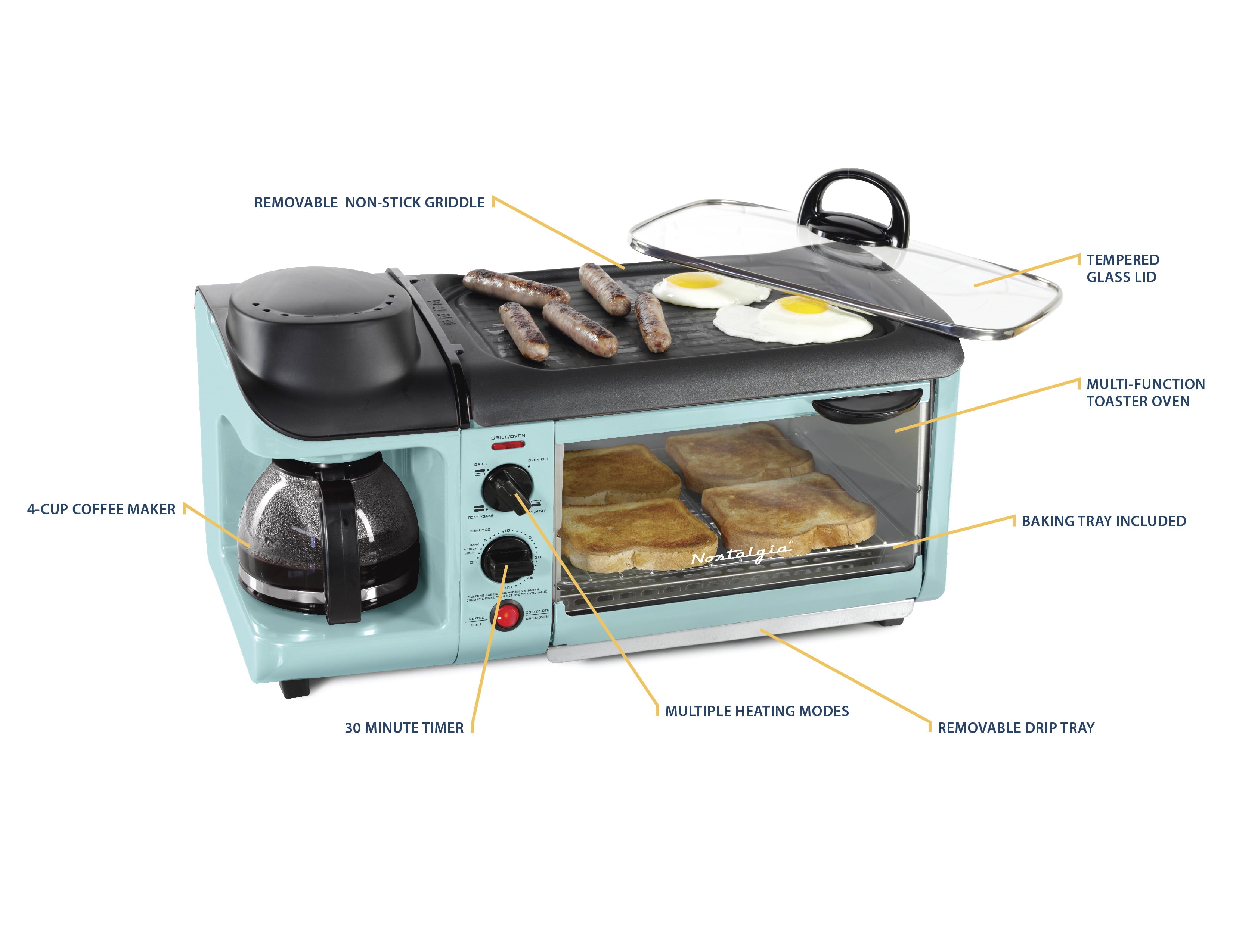 Nostalgia BST3AQ Retro 3-in-1 Family Size Electric Breakfast Station Coffeemaker Griddle Toaster Oven - Aqua: