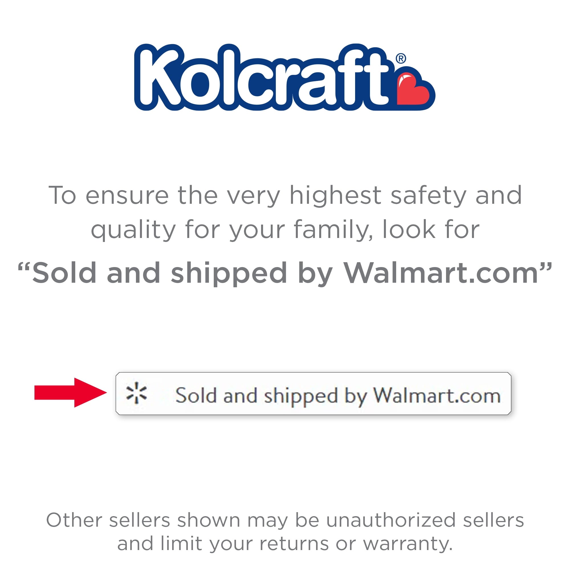 • IMPORTANT - CHECK THE SELLER PRIOR TO MAKING YOUR PURCHASE. Kolcraft cannot guarantee the quality or authenticity of Kolcraft products from unauthorized sellers on Walmart.com. To ensure the very highest safety and quality for you and your family only buy from listings that are ¡°Sold and Shipped by Walmart.com.¡± The Kolcraft warranty does not cover products purchased from unauthorized sellers.