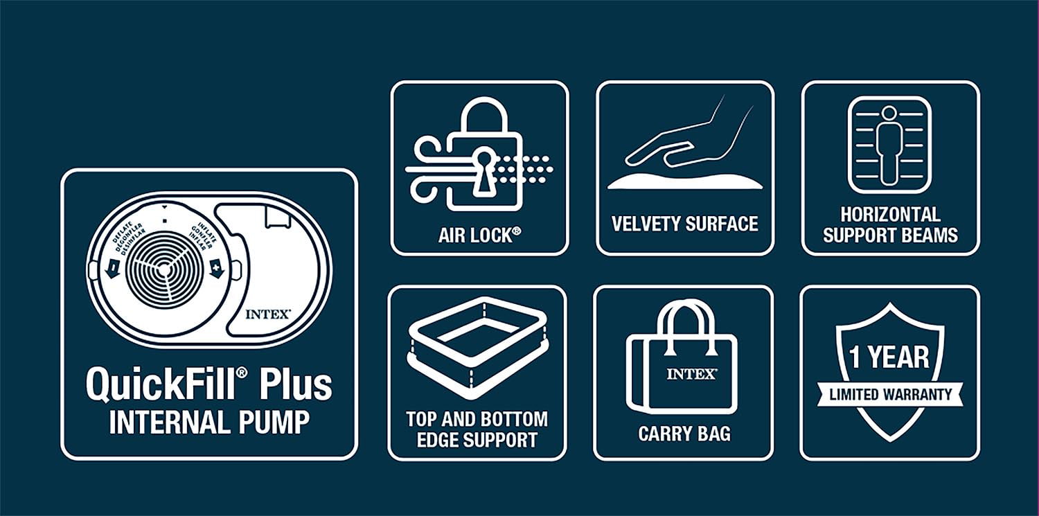 Provide unexpected guests with a comfortable place to get a good night of sleep with this Intex Queen 20 Dura-Beam Deluxe Raised Air Mattress with Built-in Pump. The unit comes equipped with many useful features including flocked sleeping surface with fiber-tech construction material. The Intex Deluxe Raised Queen air mattress also has a built-in pump which helps inflate and deflate the bed quickly. It is big enough for your guests to stretch out and with the 20 mattress height it makes it easy to get in and out of the bed. It even includes a carrying bag for easy travel and compact storage when it's not in use. Because it has Dura-beam construction it is 15 per cent lighter than traditional airbeds so transportation is easy.