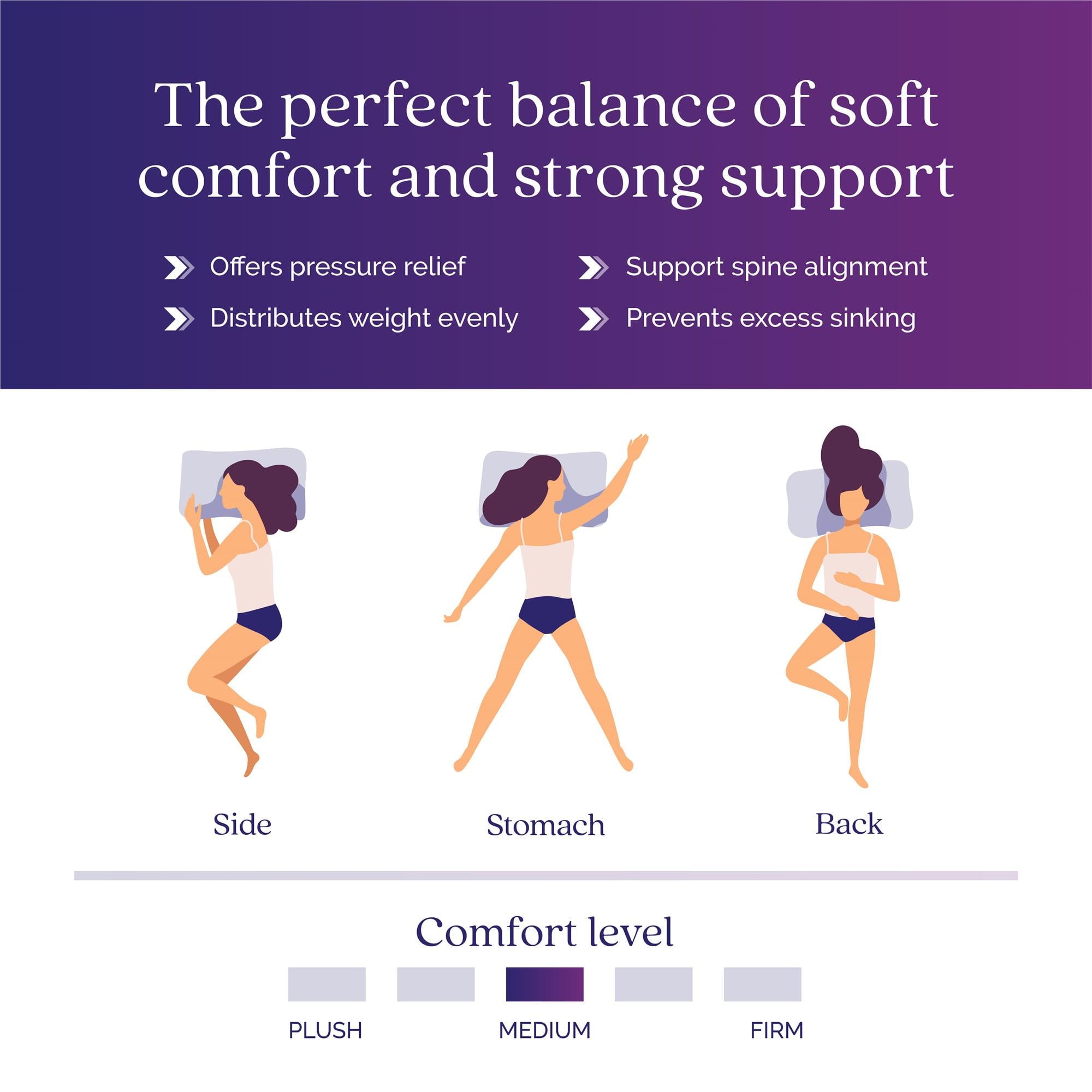 • Medium firmness level offers the best balance between soft body conforming relief and firm reliable support and is the preferred choice among most stomach side and back sleepers