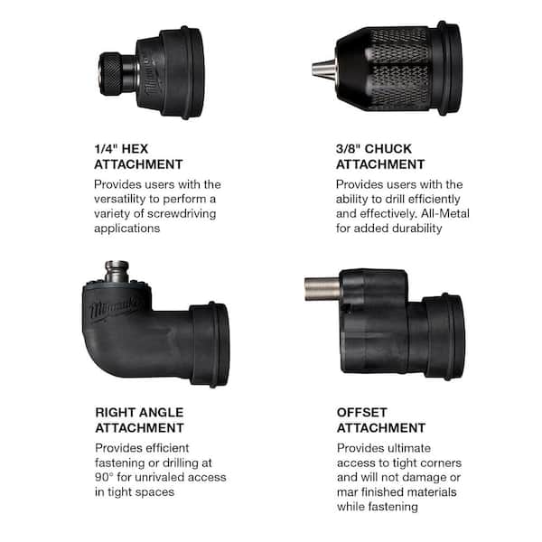 1/4 in. hex 3/8 in. chuck and offset attachments connect to right angle attachment for added versatility when drilling and fastening at a right angle