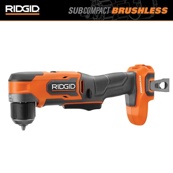 RIDGID introduces the R87701 18V SubCompact Brushless 3/8 in. Right Angle Drill. The RIDGID SubCompact Brushless lineup pairs powerful brushless motor technology in a compact tool design. This Brushless Right Angle Drill is the industry's most compact Right Angle Drill at only 3-1/2 inches in length perfect for drilling and driving in compact spaces such as inside a cabinet or in-between studs. It delivers best in class power at 375 in./lbs. of torque to power through tough applications such as drilling large spade bits through 2x4s. It features a 2-speed gearbox that allows users to match the torque and speed to the application. The 3/8 in. chuck provides an optimized bit insertion depth to change bits quickly and easily for improved productivity. Built with superior ergonomics in mind this Brushless Right Angle Drill features a two-finger paddle trigger optimized for drilling driving and tight space applications. As always this RIDGID 18V SubCompact Brushless Right Angle Drill is 100% compatible with all RIDGID 18V batteries. Best of all this tool is eligible for the Industry's Best Lifetime Service Agreement simply register within 90 days of purchase for FREE Parts FREE Service FOR LIFE. The RIDGID SubCompact Brushless Right Angle Drill includes the R87701 18V SubCompact Brushless 3/8 in. Right Angle Drill Drilling/Driving Bit Bit Holder with Screw Belt Hook with Screw and Operator's Manual. Battery and charger sold separately.