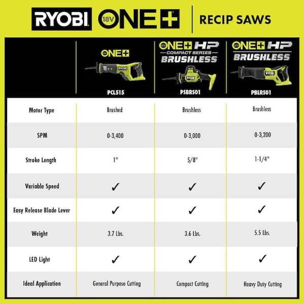Expand your RYOBI 18V ONE+ System with the RYOBI 18V Reciprocating Saw. Equipped with a 1 in. stroke length and 3400 SPM this saw is ideal for fast cuts through mutliple materials. The easy blade release lever ensures simple blade changes to quickly switch between cutting applications to complete over 145 cuts per charge. The variable speed trigger and pivoting shoe maximize control throughout the duration of the cut. Best of all it is part of the RYOBI ONE+ System of over 280 Cordless Products that all work on the same battery platform. This 18V Reciprocating Saw is backed by the RYOBI 3-Year Manufacturer¡¯s Warranty. Battery and charger sold separately.