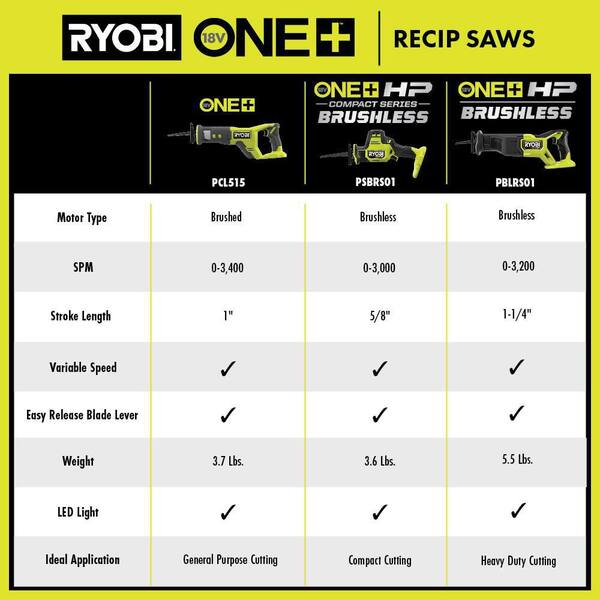 RYOBI introduces the 18V ONE+ Cordless Reciprocating Saw Kit with (1) 4.0 Ah Battery and Charger. Equipped with a 1 in. stroke length and 3400 SPM this saw is ideal for fast cuts through mutliple materials. The easy blade release lever ensures simple blade changes to quickly switch between cutting applications to complete over 145 cuts per charge. The variable speed trigger and pivoting shoe maximize control throughout the duration of the cut. The included battery and charger are compatible with all RYOBI 18V Tools. Best of all it is part of the RYOBI ONE+ System of over 280 Cordless Products that all work on the same battery platform. This 18V ONE+ Cordless Reciprocating Saw is backed by the RYOBI 3-Year Manufacturer¡¯s Warranty and includes a 4.0 Ah Battery 18V Charger and operator's manual.
