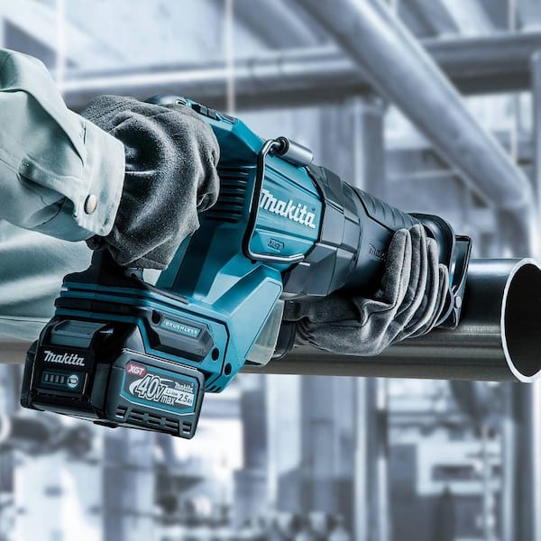 The 40V max XGT Recipro Saw Kit (GRJ01M1) delivers faster cutting speed for cutting and demolition applications. Makita-built variable 2-speed brushless motor delivers 0-2300 (low) and 0-3000 (high) strokes per minute. XGT technology delivers up to 145 cuts per charge in 2x10 SPF lumber using one XGT 4.0Ah Battery. The XRJ04T is equipped with efficiency features for faster cutting. The long 1-1/4 in. stroke length increases cutting efficiency and the refined crank mechanism design minimizes blade deflection and reduces vibration. Convenience features include a large two-finger variable speed trigger electric brake built-in L.E.D. light and a tool-less blade change for faster blade installation and removal. Ergonomically designed handle for difficult cutting applications such as overhead. XGT is a system of equipment tools batteries and chargers utilizing 40v max lithium-ion batteries. XGT is engineered to deliver high power to take on high-demand applications allowing users to completely transition to a cordless job site. XGT is equipped with advanced brushless motor engineering intelligent digital communication and superior durability features to outpower outsmart and outlast the competition.