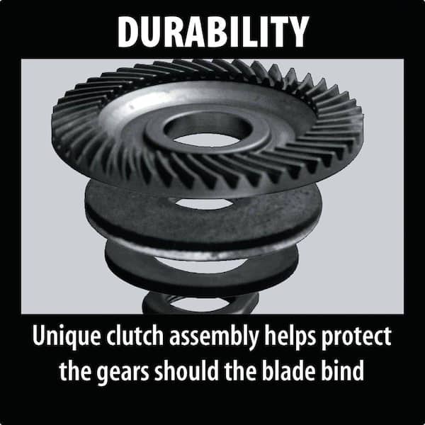 Built-in clutch reduces gear damage by disengaging gears if blade binds