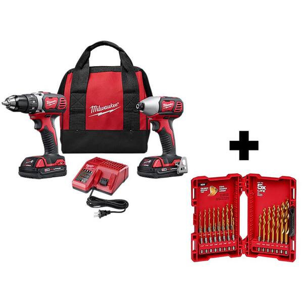 The Milwaukee M18 Cordless Lithium-Ion 2-Tool Combo Kit includes the M18 Compact Drill/Driver (2606-20) and M18 1/4 in. Hex Impact Driver (2656-20). The M18 cordless system's patented technologies and electronics innovative motor design and superior ergonomics provide users with the most efficient blend of power weight and performance in its class. The compact drill/driver and impact driver are powered by Milwaukee REDLITHIUM CP1.5 lithium-ion batteries delivering more torque more power and longer run-time than the competition. The kit includes 1 M18 Compact Drill/Driver (2606-20) 1 M18 1/4 in. Hex Impact Driver (2656-20) 2 compact REDLITHIUM CP1.5 Ah lithium-ion batteries Milwaukee 23-piece SHOCKWAVE Impact Duty Titanium Drill Bit Set an M18/M12 Multi-Voltage charger a belt clip and a contractor bag.