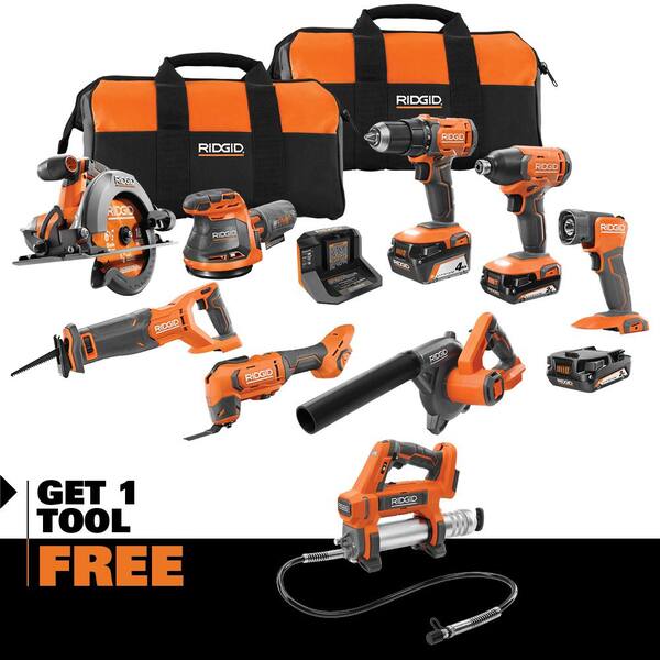 RIDGID introduces The R96258 8-Tool Combo Kit. This RIDGID Combo Kit features the 18V 1/2 in. Drill/Driver 18V Impact Driver 18V 6-1/2 in. Circular Saw 18V Reciprocating Saw 18V Oscillating Multi-Tool 18V Random Orbit Sander 18V Compact Jobsite Blower 18V LED Worklight 2.0 Ah Battery 4.0 Ah Battery Charger Tool Bag and Operator¡¯s Manuals. The 18V 1/2 in. Drill/Driver features a powerful motor that delivers 525 in./lbs. of torque and 20% faster drilling. With a variable speed trigger this powerful 18V Impact Driver delivers 1850 in./lbs. of torque and speeds up to 2800 RPM¡¯s. The 18V 6-1/2 in. Circular Saw delivers up to 3700 RPM¡¯s and a 50¡ã bevel capacity to easily cut through tough material. With a powerful motor and enhanced ergonomics the 18V Reciprocating Saw delivers 3000 SPM and features a 1-1/8 in. Stroke Length. The 18V Oscillating Multi-Tool delivers powerful cutting through multiple materials. The 18V Random Orbit Sander features fast material removal with up to 11000 OPM. The 18V Compact Jobsite Blower¡¯s powerful motor delivers 110 CFM and 160 MPH. The 18V LED Worklight features a 135¡ã pivoting head. As always this RIDGID 6-Tool Combo Kit is 100% compatible with all RIDGID 18V batteries. Best of all this combo kit is eligible for the Industry¡¯s Best Lifetime Service Agreement simply register within 90 days of purchase for FREE Parts FREE Service FOR LIFE. This kit also includes an 18V Grease Gun Right Angle Coupler and Shoulder Strap.