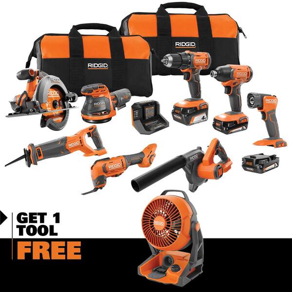 RIDGID introduces The R96258 8-Tool Combo Kit. This RIDGID Combo Kit features the 18V 1/2 in. Drill/Driver 18V Impact Driver 18V 6-1/2 in. Circular Saw 18V Reciprocating Saw 18V Oscillating Multi-Tool 18V Random Orbit Sander 18V Compact Jobsite Blower 18V LED Worklight 2.0 Ah Battery 4.0 Ah Battery Charger Tool Bag and Operator¡¯s Manuals. The 18V 1/2 in. Drill/Driver features a powerful motor that delivers 525 in./lbs. of torque and 20% faster drilling. With a variable speed trigger this powerful 18V Impact Driver delivers 1850 in./lbs. of torque and speeds up to 2800 RPM¡¯s. The 18V 6-1/2 in. Circular Saw delivers up to 3700 RPM¡¯s and a 50¡ã bevel capacity to easily cut through tough material. With a powerful motor and enhanced ergonomics the 18V Reciprocating Saw delivers 3000 SPM and features a 1-1/8 in. Stroke Length. The 18V Oscillating Multi-Tool delivers powerful cutting through multiple materials. The 18V Random Orbit Sander features fast material removal with up to 11000 OPM. The 18V Compact Jobsite Blower¡¯s powerful motor delivers 110 CFM and 160 MPH. The 18V LED Worklight features a 135¡ã pivoting head. As always this RIDGID 6-Tool Combo Kit is 100% compatible with all RIDGID 18V batteries. Best of all this combo kit is eligible for the Industry¡¯s Best Lifetime Service Agreement simply register within 90 days of purchase for FREE Parts FREE Service FOR LIFE. This kit also includes an 18V Cordless Hybrid Jobsite Fan and Operator¡¯s Manual.