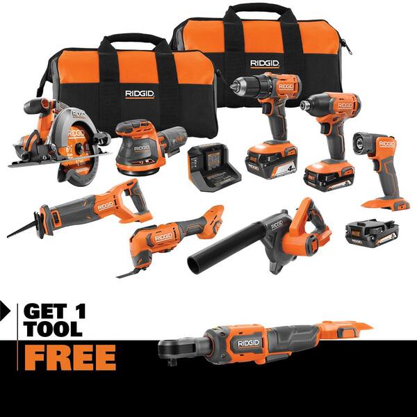 RIDGID introduces The R96258 8-Tool Combo Kit. This RIDGID Combo Kit features the 18V 1/2 in. Drill/Driver 18V Impact Driver 18V 6-1/2 in. Circular Saw 18V Reciprocating Saw 18V Oscillating Multi-Tool 18V Random Orbit Sander 18V Compact Jobsite Blower 18V LED Worklight 2.0 Ah Battery 4.0 Ah Battery Charger Tool Bag and Operator¡¯s Manuals. The 18V 1/2 in. Drill/Driver features a powerful motor that delivers 525 in./lbs. of torque and 20% faster drilling. With a variable speed trigger this powerful 18V Impact Driver delivers 1850 in./lbs. of torque and speeds up to 2800 RPM¡¯s. The 18V 6-1/2 in. Circular Saw delivers up to 3700 RPM¡¯s and a 50¡ã bevel capacity to easily cut through tough material. With a powerful motor and enhanced ergonomics the 18V Reciprocating Saw delivers 3000 SPM and features a 1-1/8 in. Stroke Length. The 18V Oscillating Multi-Tool delivers powerful cutting through multiple materials. The 18V Random Orbit Sander features fast material removal with up to 11000 OPM. The 18V Compact Jobsite Blower¡¯s powerful motor delivers 110 CFM and 160 MPH. The 18V LED Worklight features a 135¡ã pivoting head. As always this RIDGID 6-Tool Combo Kit is 100% compatible with all RIDGID 18V batteries. Best of all this combo kit is eligible for the Industry¡¯s Best Lifetime Service Agreement simply register within 90 days of purchase for FREE Parts FREE Service FOR LIFE. This kit also includes an 18V Brushless 3/8 in. Ratchet and Operator's Manual.