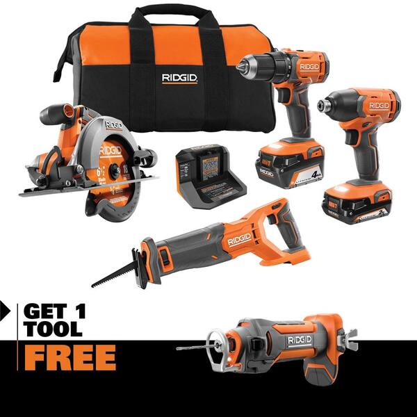 Includes: R86001 18V 1/2 in. Drill/Driver R86002 1/4 in. Impact Driver R8655 6-1/2 in. Circular Saw R8646 Reciprocating Saw R87002 18V 2.0 Ah Battery R87004 18V 4.0 Ah Battery R86093 Charger