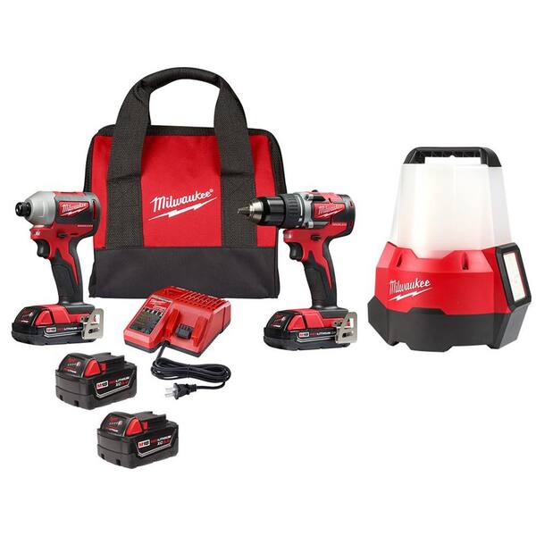 The 2892-22CT M18 Kit includes the 1/2 in. Compact Brushless Drill Driver (2801-20) and the 1/4 in. Hex Compact Brushless Impact Driver (2850-20). The M18 Cordless System's patented technologies and electronics innovative motor design and superior ergonomics provide the most efficient blend of power weight and performance in the industry. The M18 Compact Brushless Drill/Driver is the Most powerful compact 18-Volt drill on the market. The M18 1/4 in. Hex Compact Brushless Impact Driver has the fastest application speed its class and delivers 1600 in./lbs. of torque. Both tools feature Milwaukee built brushless motors RedLINK Electronics and REDLITHIUM batteries that provide more efficient power delivery for fewer trips to the charger. The Milwaukee M18 REDLITHIUM XC3.0 Battery delivers up to 2X more runtime 20% more power and 2X more recharges than standard lithium-ion batteries. The Milwaukee M18 RADICompact Site Light with Flood Mode provides a 2-in-1 solution for area and task lighting for less to carry. The compact LED light delivers 2200 lumens in area mode and 1000 lumens in flood mode.