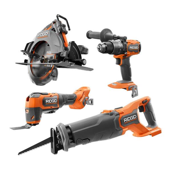 RIDGID introduces the 18V Brushless Cordless 3-Tool Combo Kit (Tools Only) with Brushless Cordless 1/2 in. Hammer Drill/Driver. The RIDGID 18V Brushless Reciprocating Saw offers 20% faster cutting compared to the previous model (R8643) and features a premium orbital action switch for fast wood cutting. The RIDGID 18V Brushless Oscillating Multi-Tool delivers up to 20000 oscillations per minute (OPM) and is controlled by an easily accessible variable speed dial giving users ultimate control to match speed to any application. The Brushless 18V 7-1/4 In. Circular Saw features a high performance brushless motor and advanced electronics that provide best-in-class power and intelligence. The RIDGID 18V Brushless 1/2 in. Hammer Drill delivers up to 800 in./lbs. of torque for maximum power. With registration this kit is backed by the Industry's Only Lifetime Service Agreement: FREE Parts. FREE Service. For LIFE. This 18V Brushless Cordless 3-Tool Combo Kit includes an 18V Brushless Reciprocating Saw with blade an 18V Brushless Oscillating Multi-Tool with Sanding Pad Saw Blade Wood Cutting Blade Sandpaper an 18V Brushless 7-1/4 in. Circular Saw with 7-1/4 in. blade blade wrench vacuum attachment dust chute rafter hook an 18V Brushless 1/2 in. Hammer Drill/Driver with Auxiliary Handle Driving Bit Belt Clip with Screw Bit Holder with Screw and operator's manual. Battery and charger sold separately.