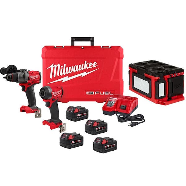 (1) M18 FUEL 1/2 in. hammer drill (2904-20) (1) M18 FUEL 1/4 in. hex impact driver (2953-20)(1) M18 PACKOUT Light/Charger (4) M18 REDLITHIUM XC5.0 battery (1) M18 and M12 multi-voltage charger (1) side handle (1) BMC Case