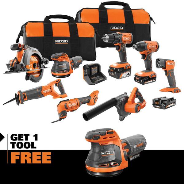 RIDGID introduces The R96258 8-Tool Combo Kit. This RIDGID Combo Kit features the 18V 1/2 in. Drill/Driver 18V Impact Driver 18V 6-1/2 in. Circular Saw 18V Reciprocating Saw 18V Oscillating Multi-Tool 18V Random Orbit Sander 18V Compact Jobsite Blower 18V LED Worklight 2.0 Ah Battery 4.0 Ah Battery Charger Tool Bag and Operator¡¯s Manuals. The 18V 1/2 in. Drill/Driver features a powerful motor that delivers 525 in./lbs. of torque and 20% faster drilling. This powerful 18V Impact Driver delivers 1850 in./lbs. of torque and speeds up to 2800 RPM¡¯s. The 18V 6-1/2 in. Circular Saw delivers up to 3700 RPM¡¯s and a 50¡ã bevel capacity to easily cut through tough material. With a powerful motor and enhanced ergonomics the 18V Reciprocating Saw delivers 3000 SPM and features a 1-1/8 in. Stroke Length. The 18V Oscillating Multi-Tool delivers powerful cutting through multiple materials. The 18V Random Orbit Sander features fast material removal with up to 11000 OPM. The 18V Compact Jobsite Blower¡¯s powerful motor delivers 110 CFM and 160 MPH. The 18V LED Worklight features a 135¡ã pivoting head. As always this RIDGID 6-Tool Combo Kit is 100% compatible with all RIDGID 18V batteries. Best of all this combo kit is eligible for the Industry¡¯s Best Lifetime Service Agreement simply register within 90 days of purchase for FREE Parts FREE Service FOR LIFE. This kit also includes an 18V Cordless 5 in. Random Orbit Sander dust bag and 80 grit hook and loop sandpaper.