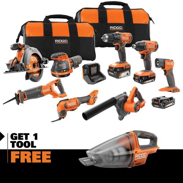 • 18V Cordless 8-Tool Combo Kit with (3) Batteries. Charger. and Bag with 18V Hand Vacuum