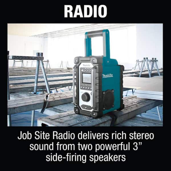 Job site radio delivers rich stereo sound from 2 powerful 3 in. side-firing speakers