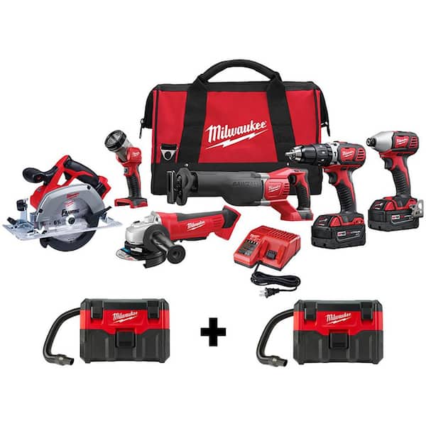 The Milwaukee M18 18-Volt Lithium-Ion Cordless Combo Kit (6-Tool) has all the tools you need to tackle a wide range of drilling driving cutting and grinding applications. Featuring patented technologies and electronics an innovative motor design and superior ergonomics these tools give you the power weight and performance to tackle whatever you throw at them. Powered by REDLITHIUM for greater torque and longer run time this set is durably made to withstand the toughest jobsite wear and tear for years of reliable use. The M18 Cordless 2 Gal. Wet/Dry Vacuum provides users with a Powerful and Portable Wet/Dry Clean-up tool. A high performance motor creates powerful suction for both wet and dry applications. Its stackable design and organized on-board storage keeps all of the attachments inside the unit for convenient transport and storage.