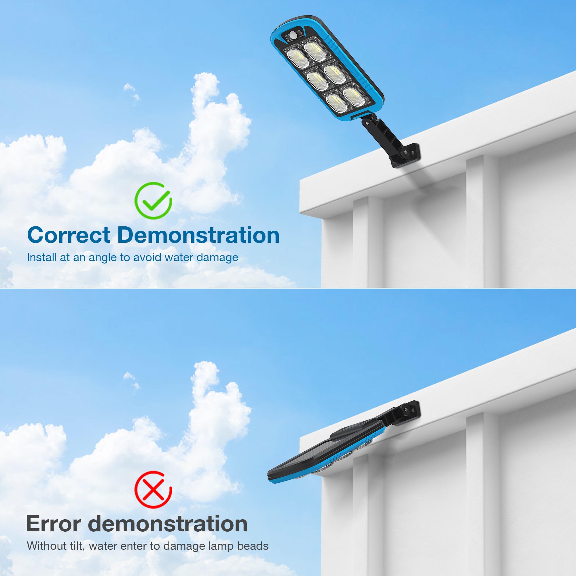 - [Warm Tips]: For first-time use, please charge the solar lights outdoor panel in ample sunlight before turning on the lights. To ensure sufficient sunlight, install the solar street light in an unobstructed area, and cover the panel with a shading object during daytime operation.