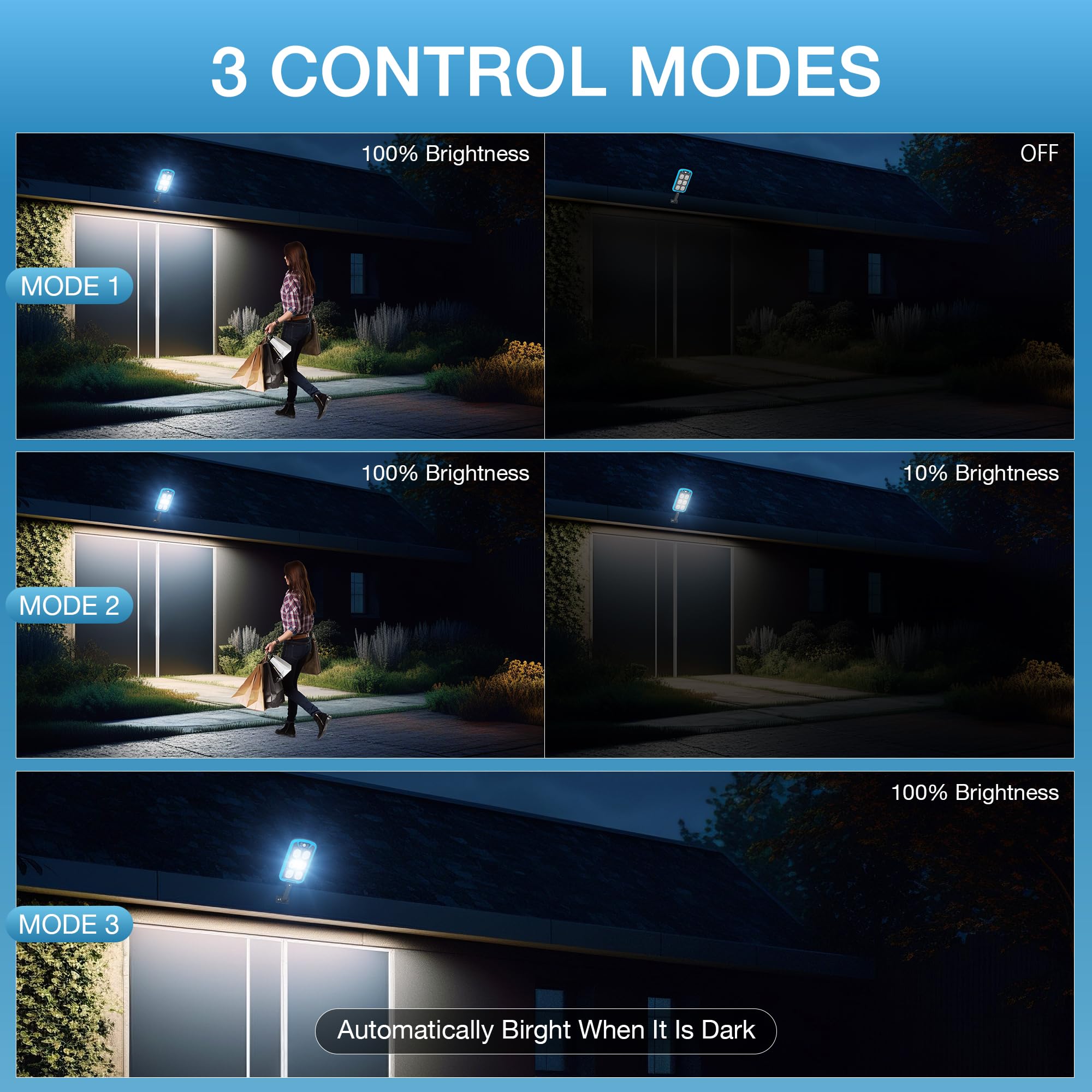 - [3 Work Modes]:This solar light has 3 working modes and smart dusk to dawn. MODE 1: People are close to 100% brightness, far away from turningoff the lights. MODE 2: People are close to 100% brightness, far away from 10% brightness. MODE 3: Automatically bright when it is dark. Dusk to dawn: When the solar light switch is turned on, the solar parking lot light will run automatically without maintenance, automatically on at dusk, automatically off at dawn.