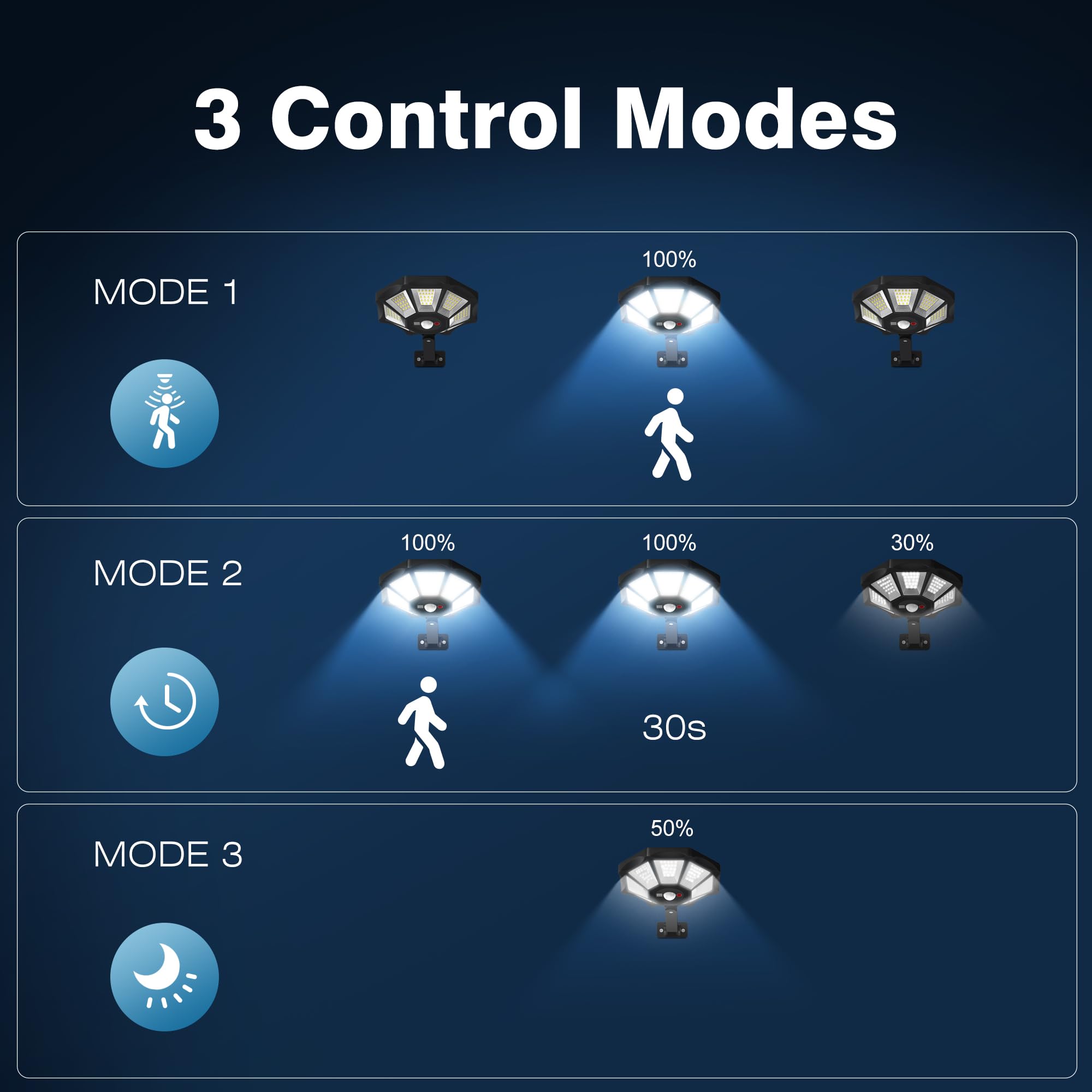 • [INTELLIGENT RADAR SENSOR CHIP]: The solar parking lot lights provides 3 lighting modes: Mode 1: 100% light brightness when motion is detected, and automatically turns off when there is no motion at night. Mode 2: When motion is detected, the light is at 100% brightness. After 30 seconds of no motion at night, it goes to 30% brightness. Mode 3: Lights automatically turn on at night at 50% brightness.