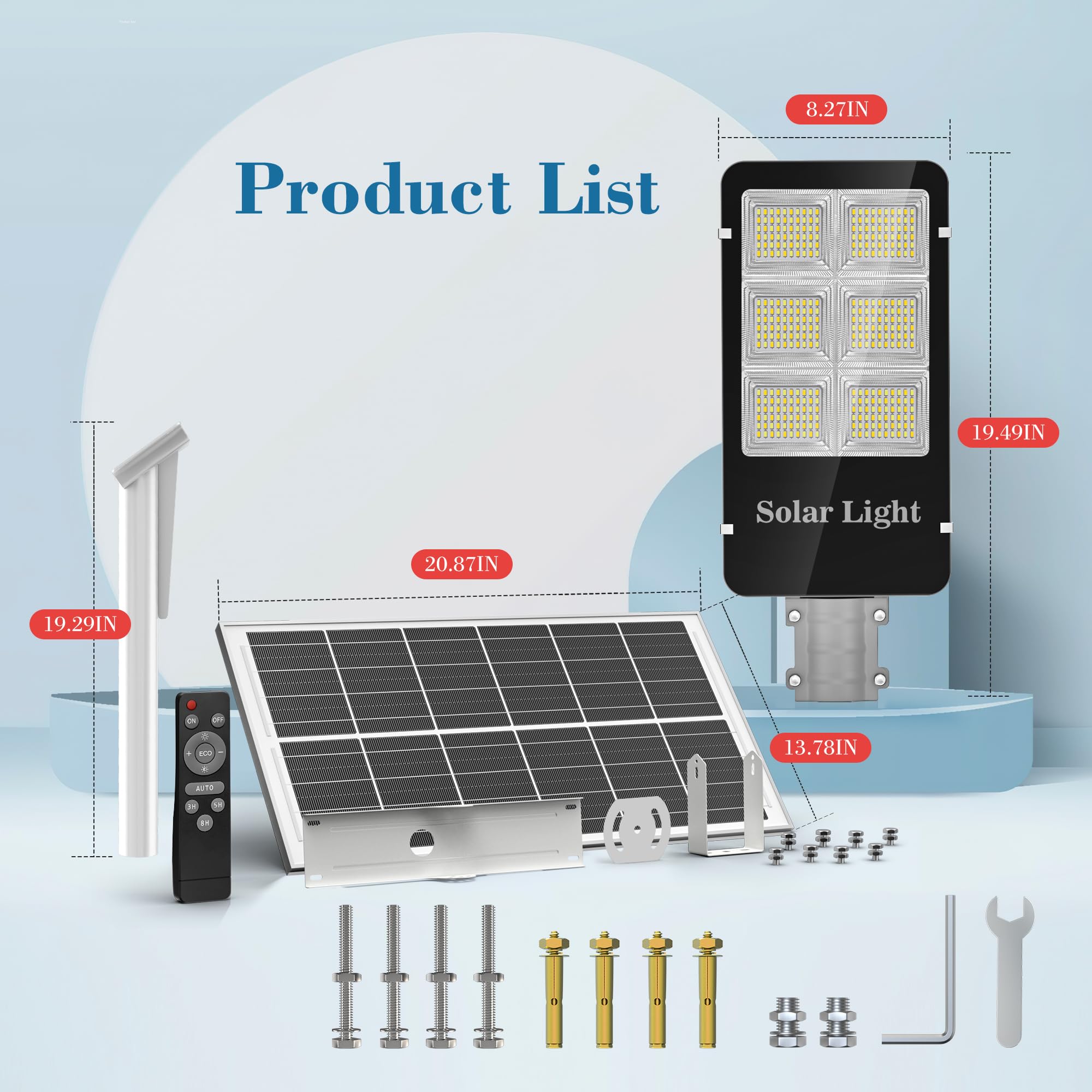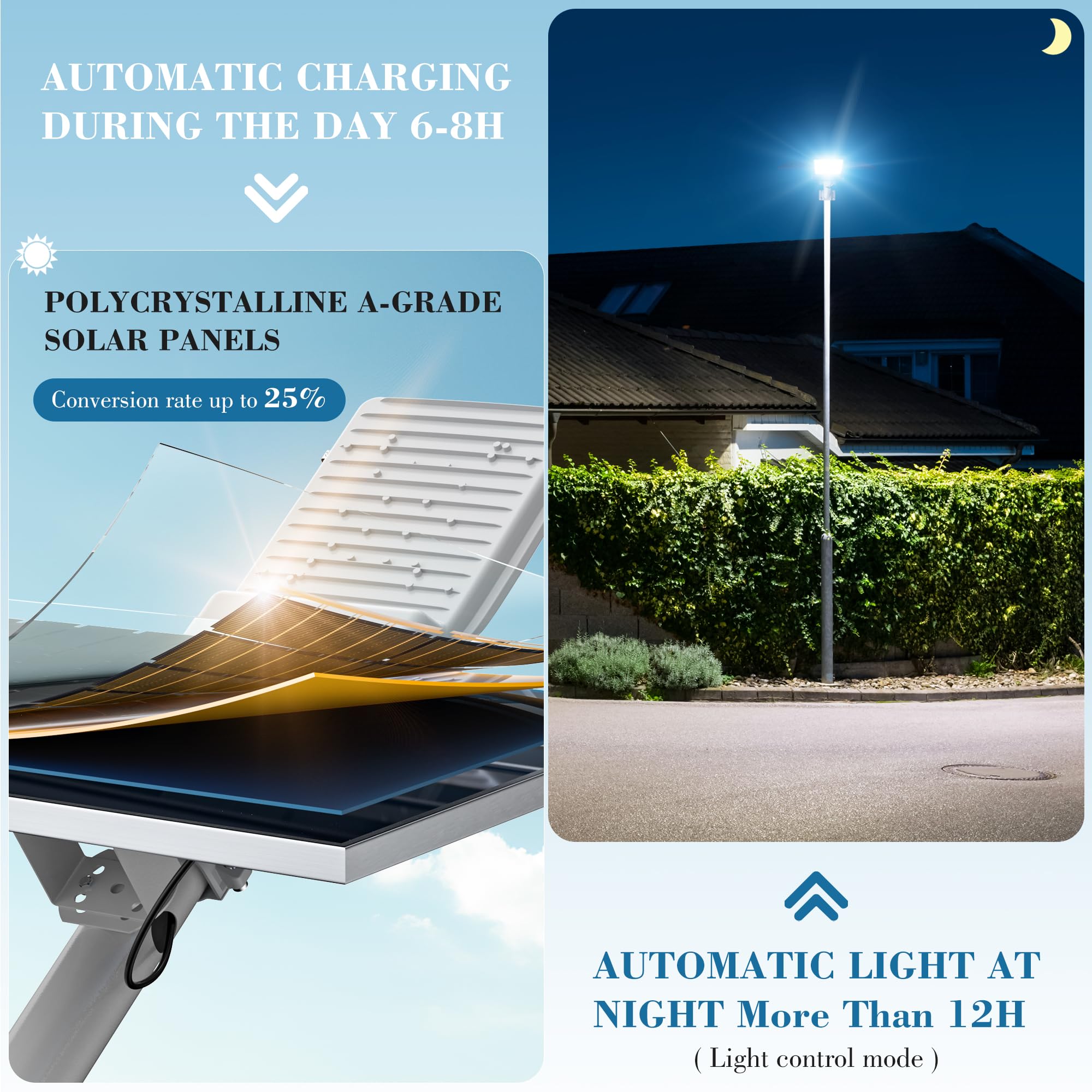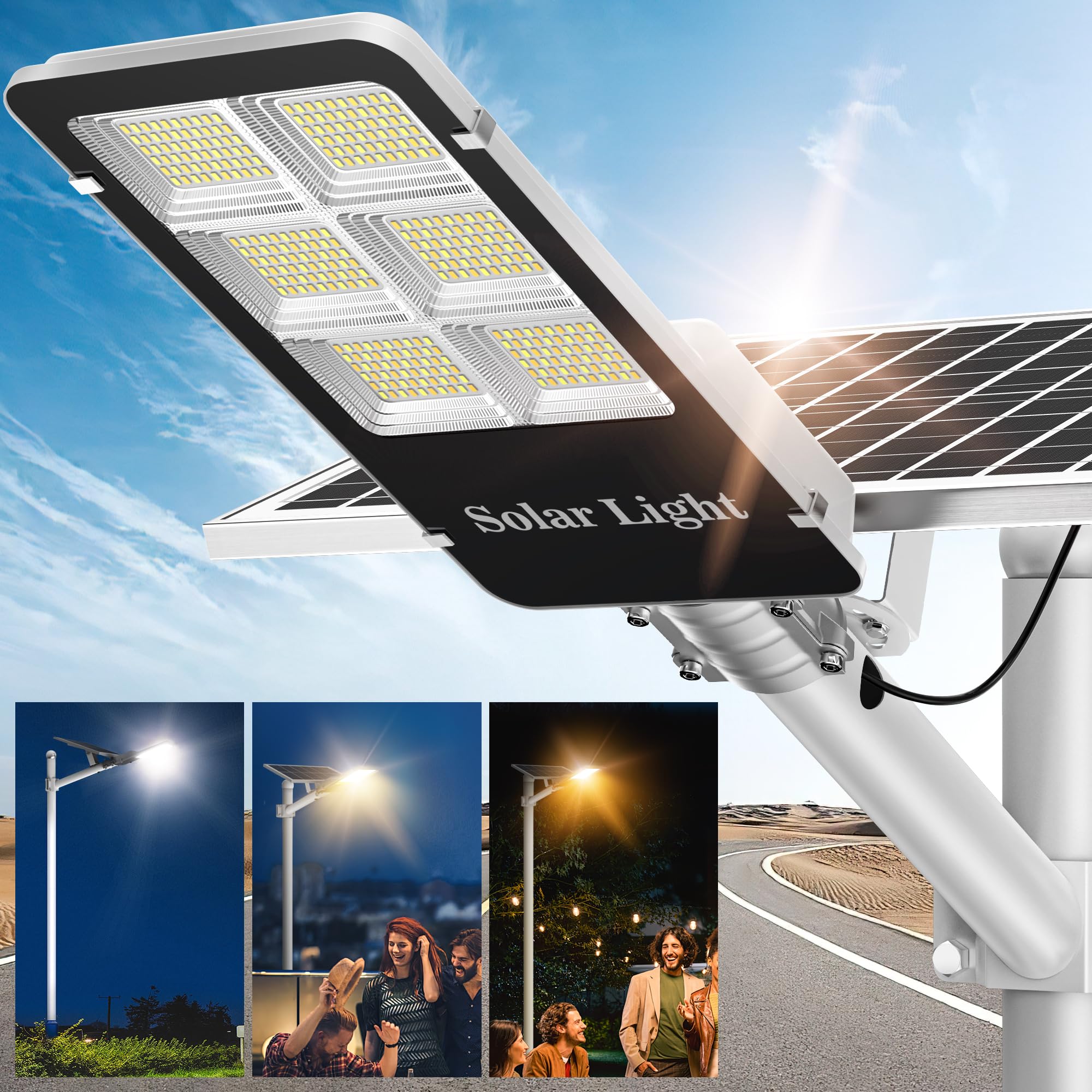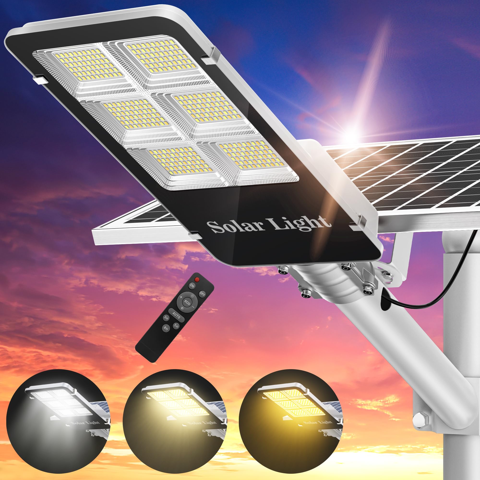 - [INTELLIGENT LIGHT SENSOR CHIP]: Solar powered street lights run automatic operation without maintenance. [1]-Dusk to dawn mode: automatically turn on at dusk and turn off at dawn. [2]-Remote control: full/half brightness, 3/5/8 hours automatic countdown mode, 9 brightness up/down gears. [3]-ECO: Adjust color temperature after lighting - white light - warm light - daylight. NOTE: light up the whole night without motion sensing.