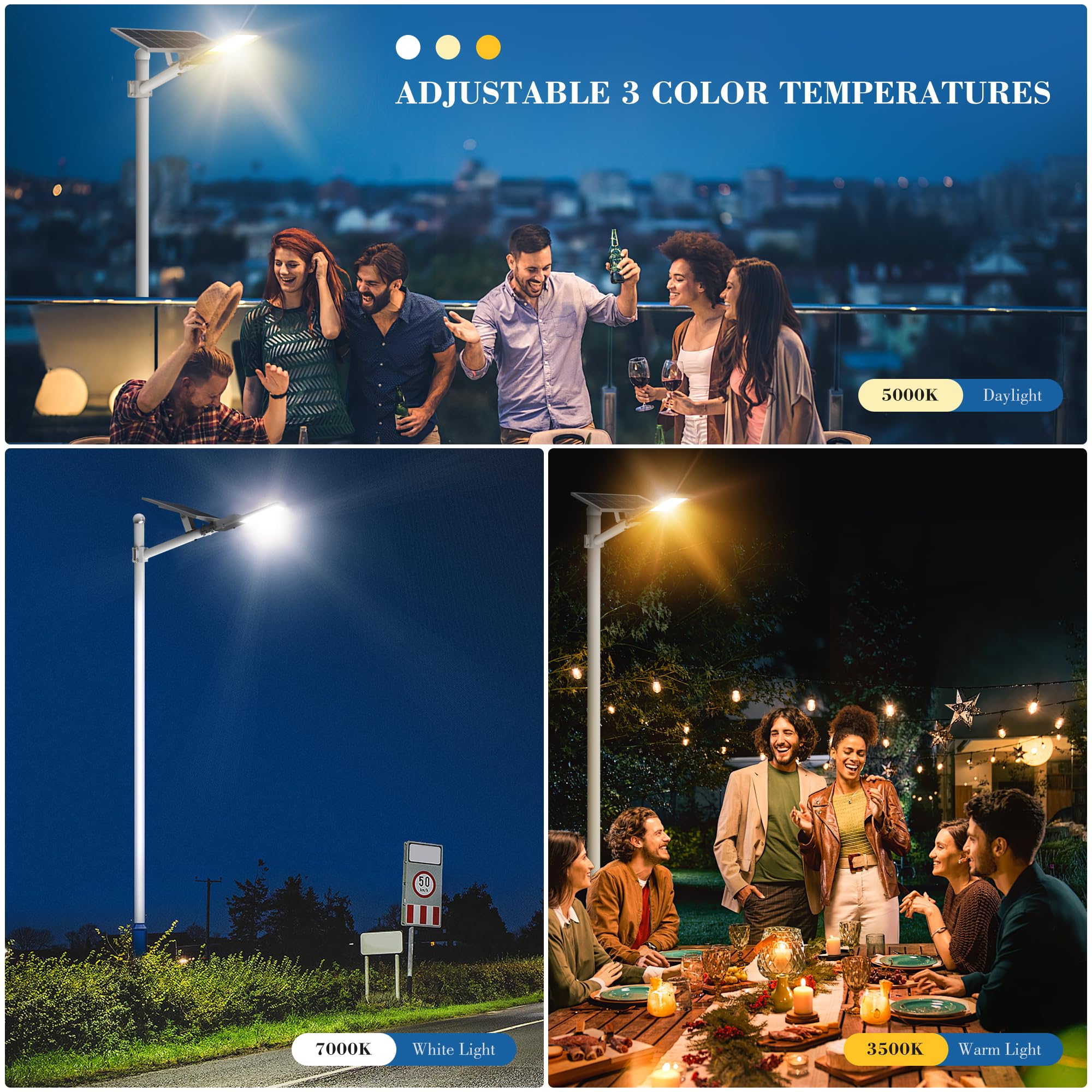 - [ADJUSTABLE COLOR TEMPERATURE]: OKPRO solar street lights outdoor waterproof with Adjustable Color Temperature - Choose from three vibrant lighting tones, including Cool White (7000k), Warm White (3500k), and Neutral White (5000k), enhancing the ambiance of your outdoor space. Ensure a beautifully bright environment, allowing you to select the perfect lighting for a captivating night atmosphere.