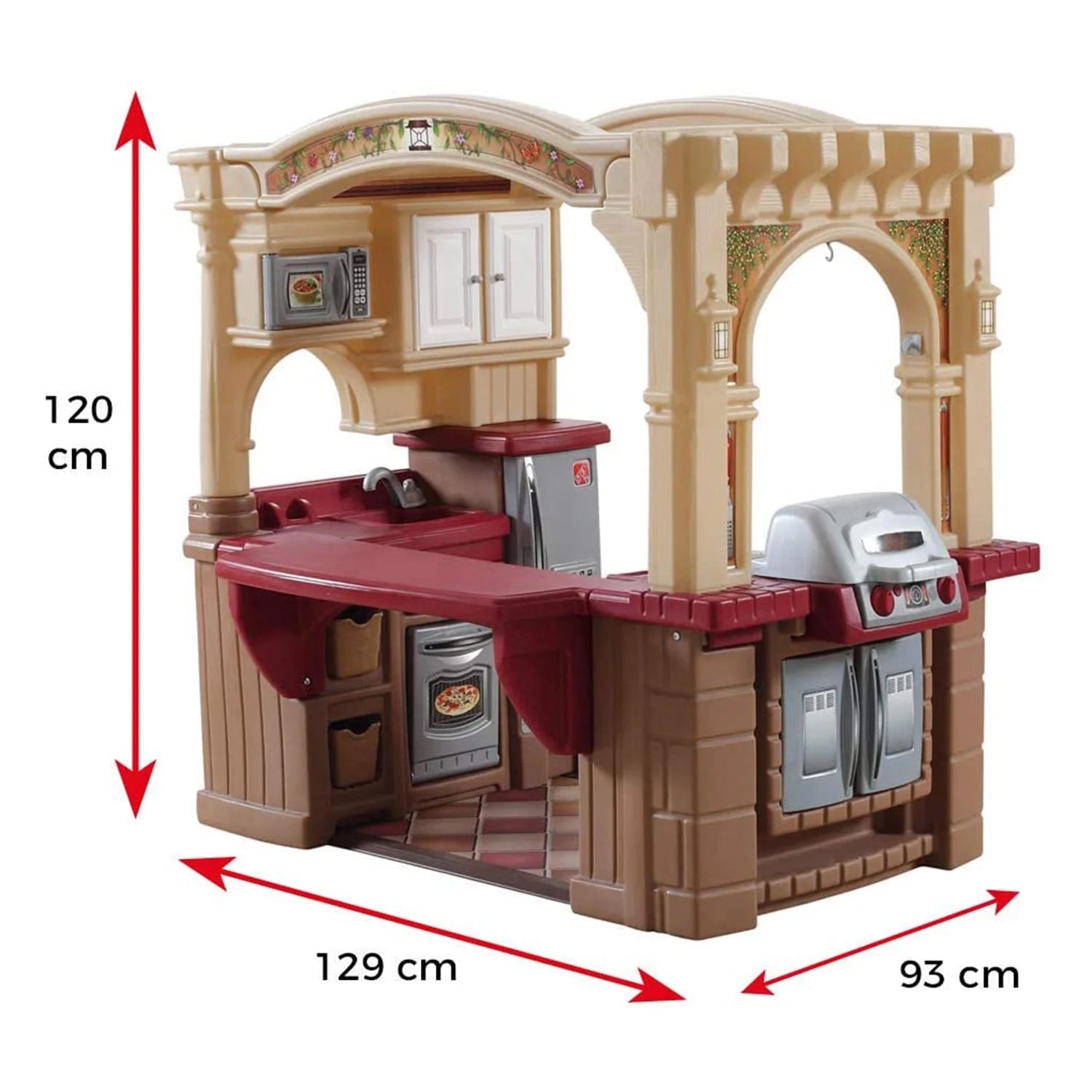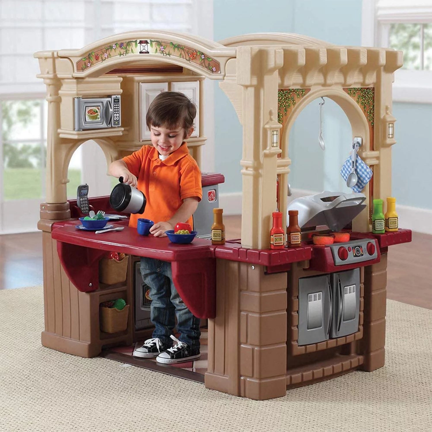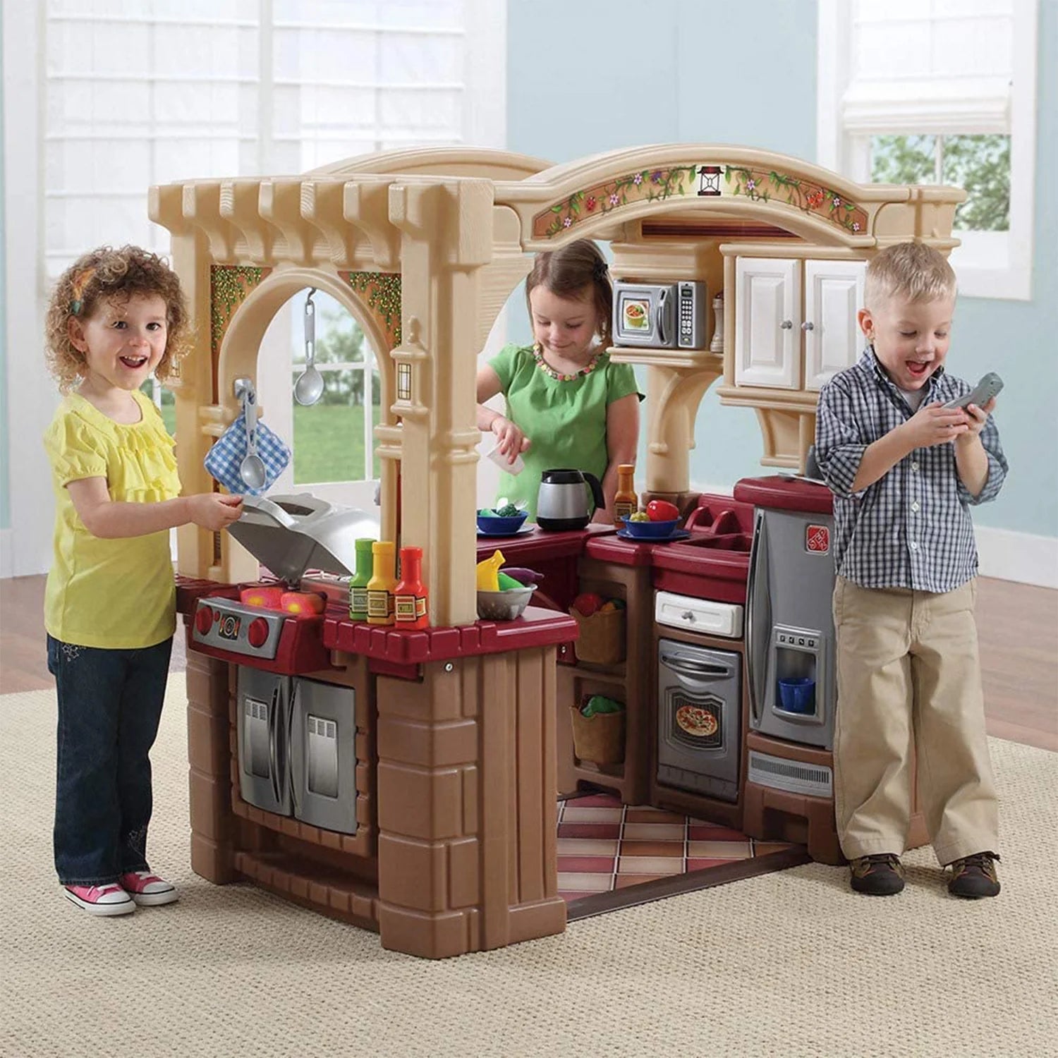 The Step2 Grand Walk-in Kitchen is more than a typical kid kitchen. The word grand in the name is an understatement when describing this play kitchen set with such an elegant design developed for children ages 2 years and up. This Step2 kitchen has many features starting with an attached toy grill. over 100 accessories (which include: play food. utensils. pots. pans and more). stainless steel appliances and plenty of storage space! This toddler kitchen encourages social play by being a three-sided play kitchen. Inside this kitchen is a faux stainless-steel refrigerator. oven and microwave for starters. but also large sink with a realistic swivel push button faucet! Outside is a realistic kid grill to cook up hotdogs or burgers and a pass-through window for serving and entertaining friends. This plastic play kitchen lower section has a brick and wood design while the top resembles a pergola. As mentioned this kitchen is made out of sturdy plastics which means the grand walk in classic kitchen can also an outdoor play kitchen. Lastly. this kid kitchen playset comes with a 2-year limited warranty!