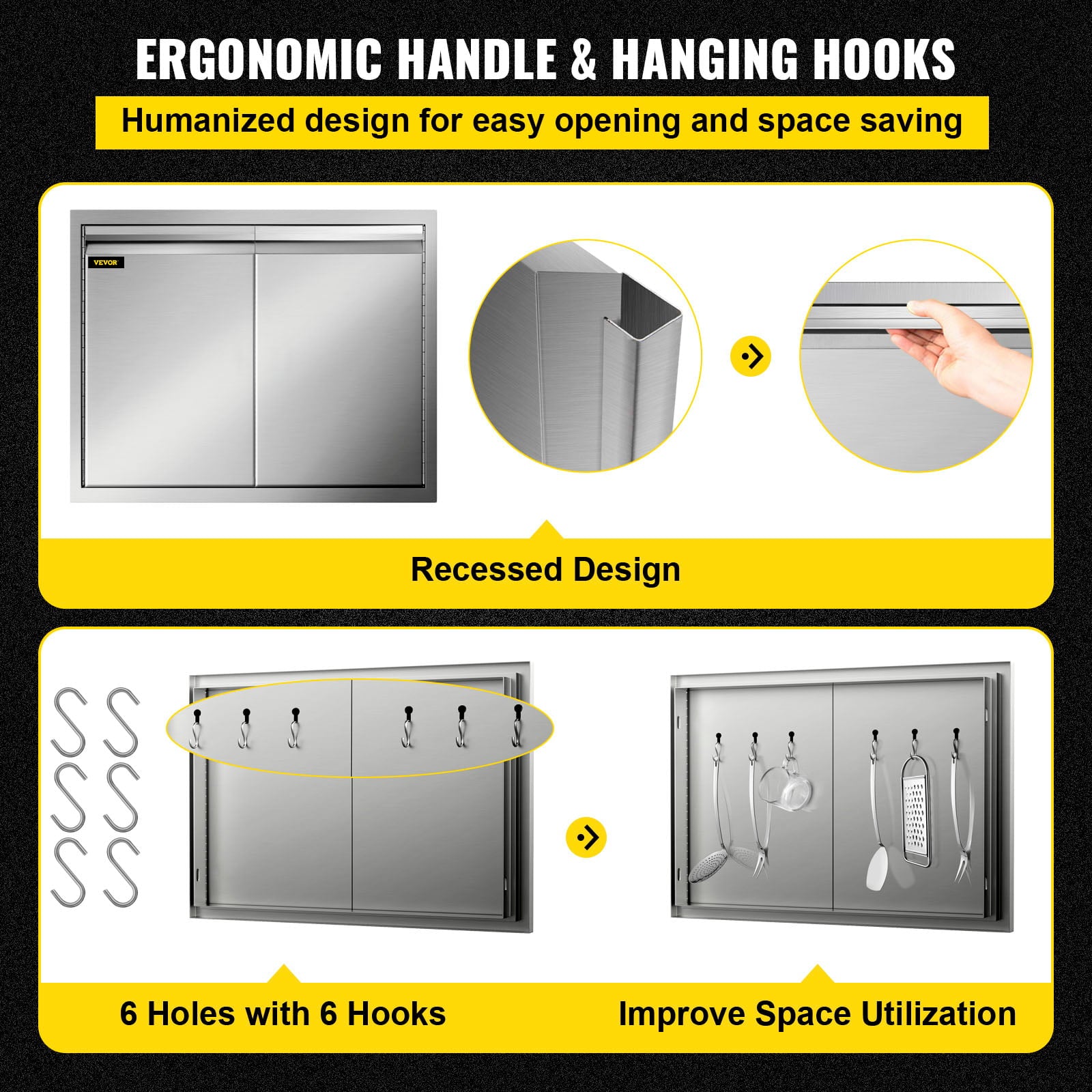 - With 6 Sturdy Hooks:There are 6 holes on the outdoor kitchen cabinet doors for hanging hooks. We also provide you with 6 hooks to hang small items like rags tongs and mitts improving space utilization.