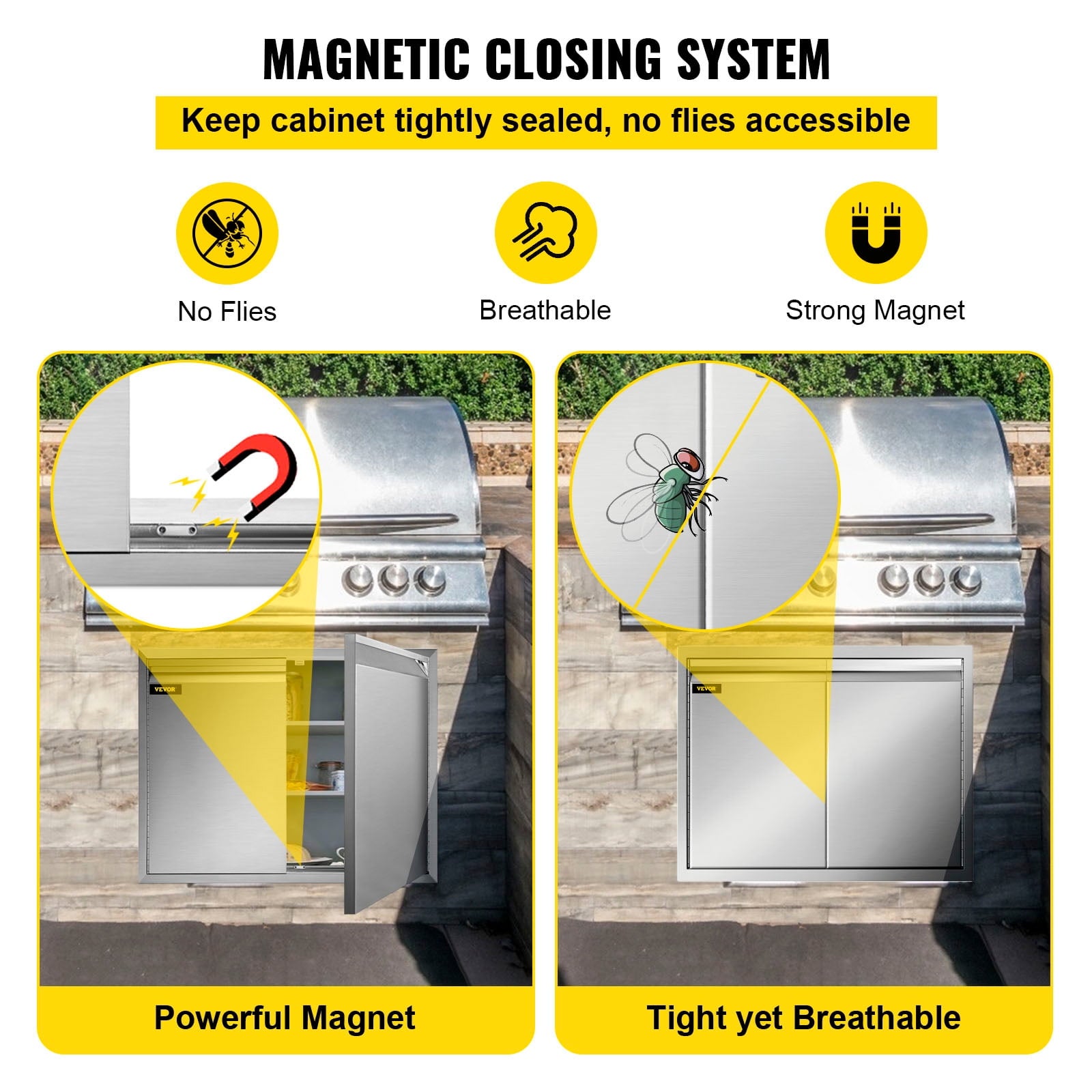 - Magnet Adsorption:Our BBQ island doors are tightly sealed with two powerful magnets on each top and bottom frame and firm door hinges. Therefore no flies can access your food or whatsoever in the cabinet.
