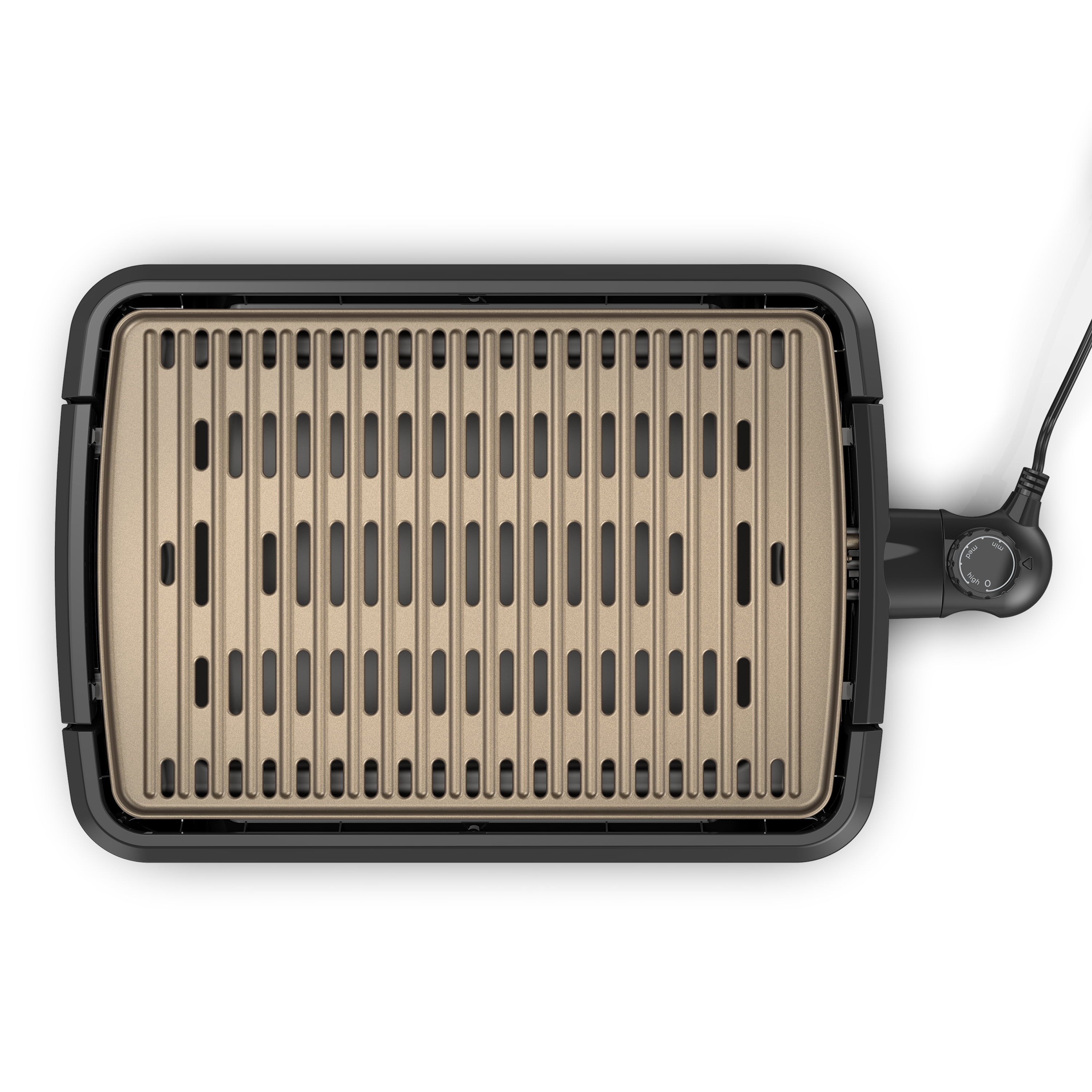 • Open Grate Grilling - Up to 80% less smoke*! The open grate design allows grease to drain onto the drip tray cooling it down before it can burn and produce smoke.