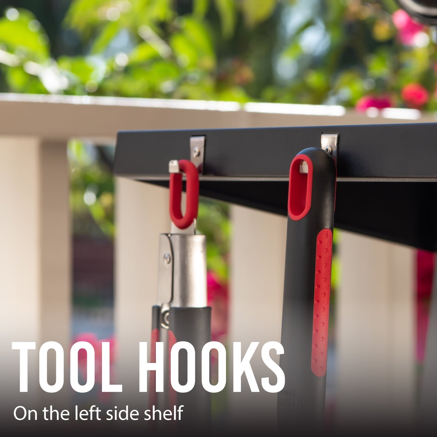 - Two fixed side shelves offer ample space for food prep plus attached hooks on the left are perfect for storing grill tools.
