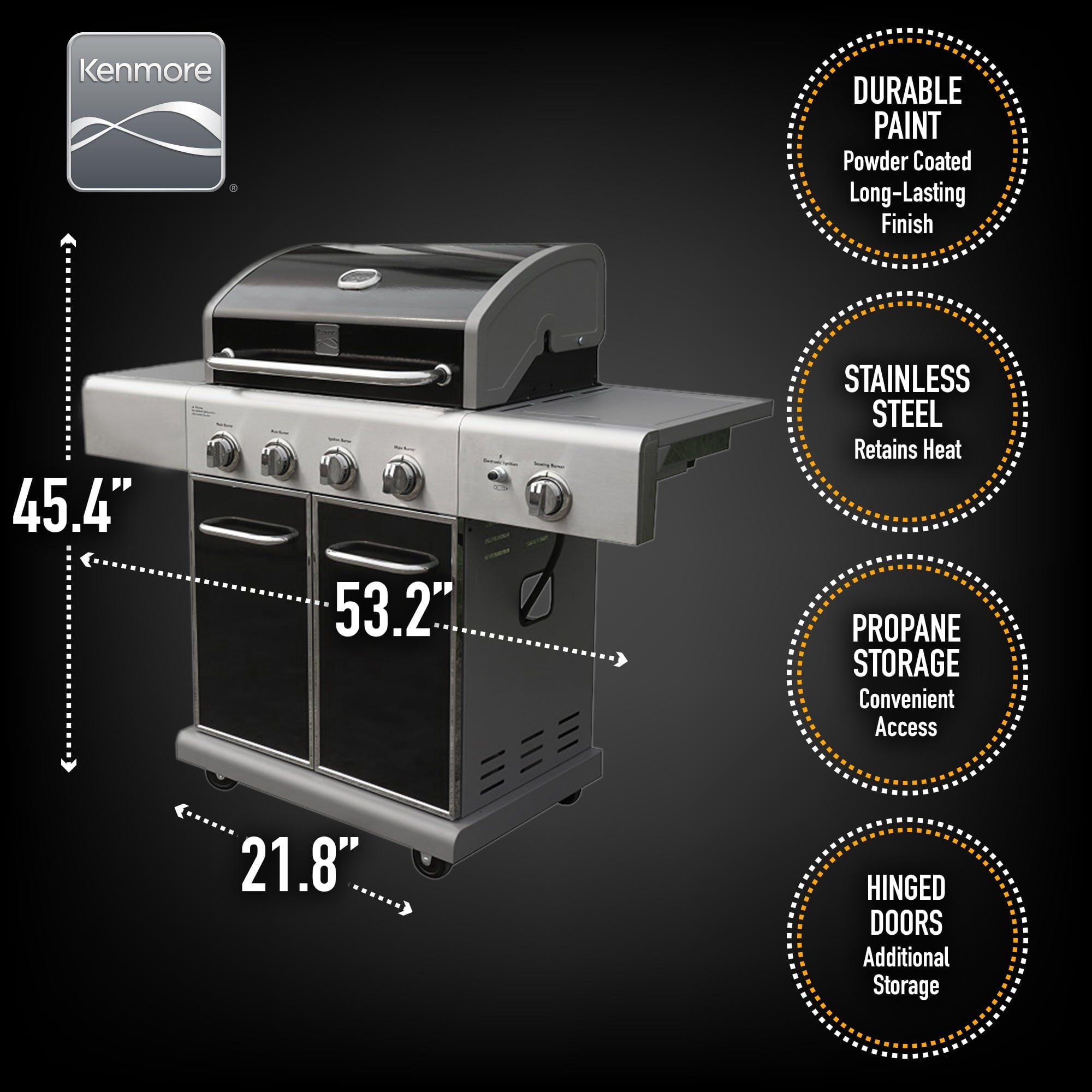 Cook up delicious meals for family and friends on the Kenmore 4-Burner Outdoor Propane Gas Grill with Side Searing Burner. This stainless steel grill offers a total of 52000 BTUs �?each of the 4 primary burners is rated 10000 BTUs and the side searing burner 12000 BTUs - a 593 square inch total cooking surface plus porcelain-coated lid steel endcaps and liner porcelain coated cast iron cooking grates with wire warming rack firebox and flavorizer bars stainless steel control panel and chrome plated knobs. Step up your grilling game with this amazing gas grill! An enclosed cart grill features powder-coated doors with stainless steel trim an aluminum grease cup and electronic ignition for an easy start every time. Plus for added convenience the 3 casters have 2 locking capabilities for secure transport. Get ready to impress family and friends at your next backyard barbecue with this top-of-the-line Kenmore 4-Burner Outdoor Propane Gas Grill with Side Searing Burner in Stainless Steel with Black Trim!