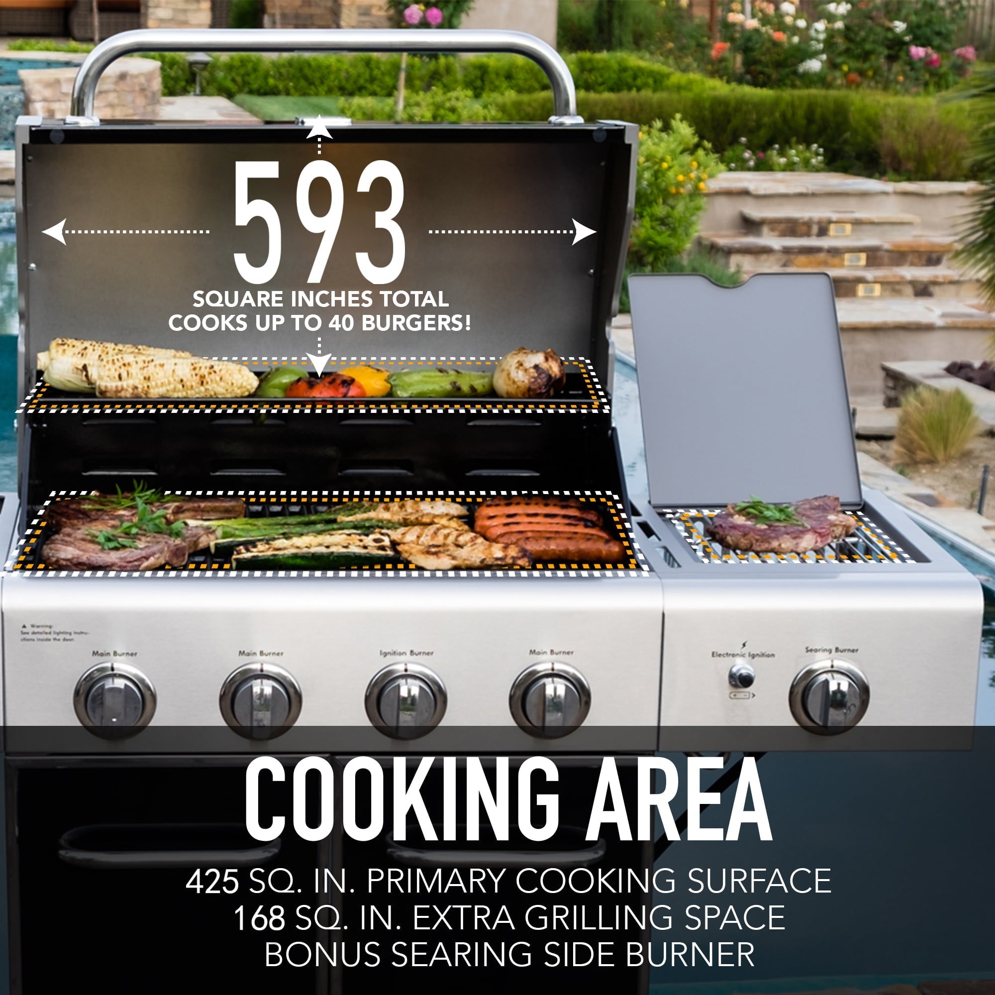 • 4-Burner Outdoor Propane Gas Grill with Searing Side Burner. Stainless Steel with Black Trim